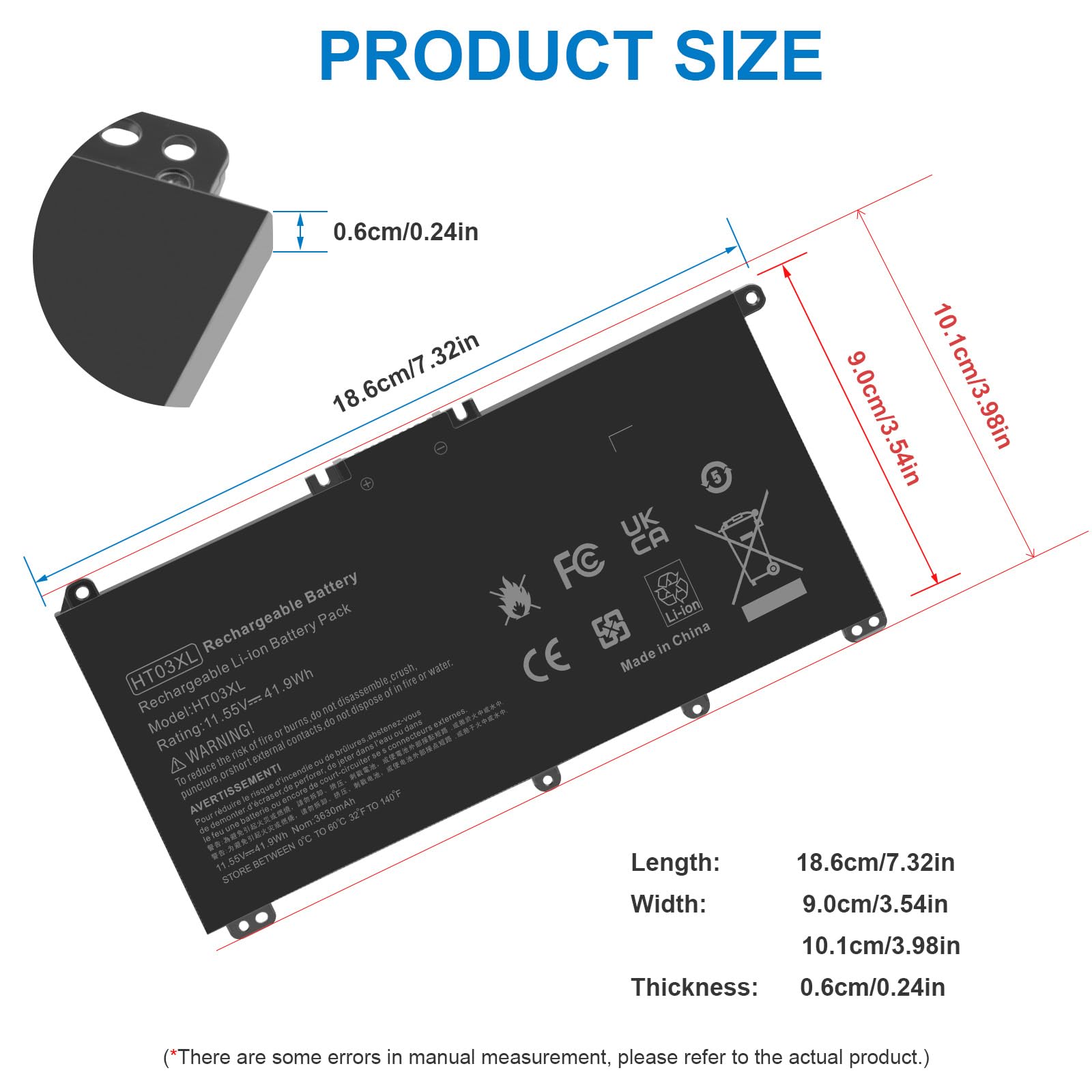 • Compatible Model: HT03XL Battery for HP Pavilion 15-CS 15-CW 15-DA 15-DB 15-DW 15-DY 15-CU 15-EF 15-CR 15G-DR 15T-DA 15T-DB 15T-DW 15Z-CW 17-BY 17-CA 17Z-CA 14-CE 14-CF 14-CK 14-CM 14-DH 14M-DH 14-DF 14-DQ 14-DK 14-FQ 14-MA 14Q-CS 14Q-CY 14S-CF 14S-CR 15-da0xxx 15-da1xxx 15-db0xxx 15-db1xxx 17-by0xxx 17-by1xxx 17-ca0xxx 17-ca1xxx 15-cs0xxx 15-cs1xxx 15-cs3xxx 15-dw0xxx 15-dw1xxx 15-dy0xxx 15-dy1xxx 14-dh1xxx 14m-dh0xxx 14-ce0xxx 14-cf0xxx 14-cf1xxx 14-ck0xxx 14-df0xxx 14-dk0xxx and more