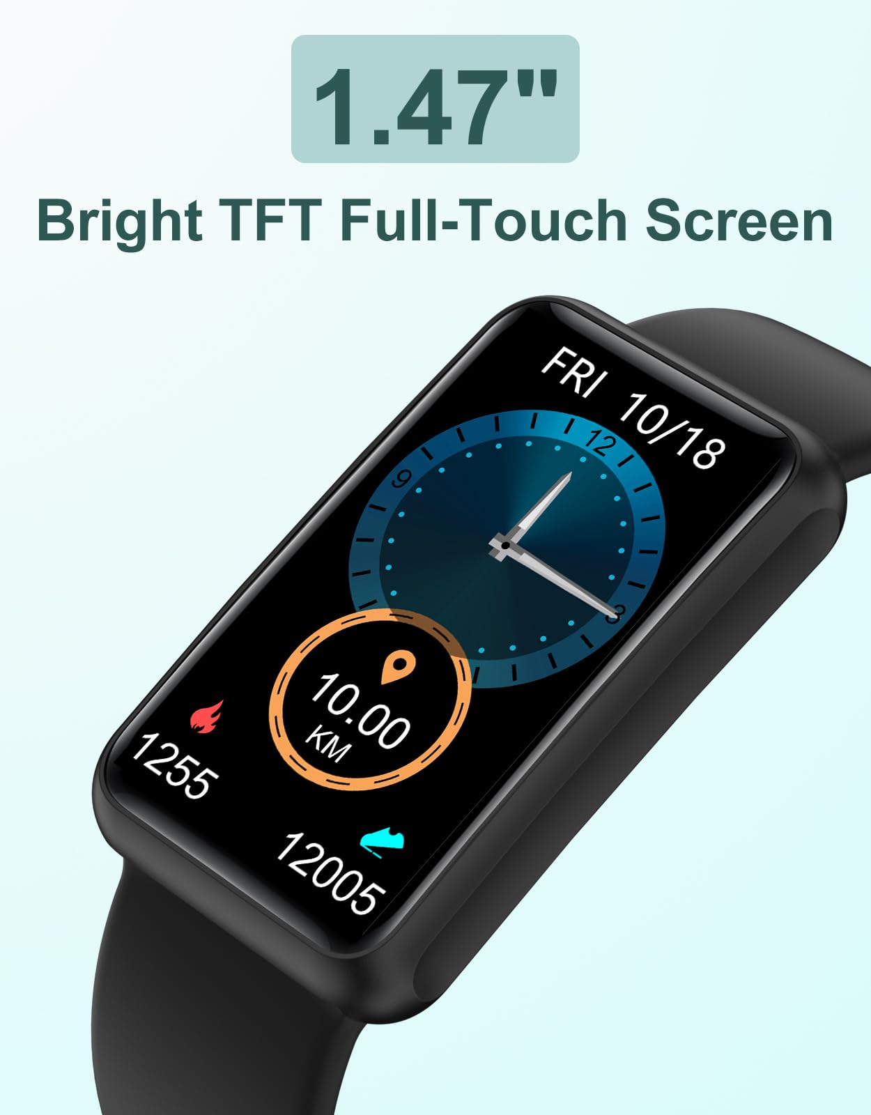 • 【Fitness Tracker With Large Color Touchscreen】Unlike most traditional fitness trackers with just touch button, our fitness tracker featuring a large 1.47-inch TFT full-touch color screen with adjustable brightness, it ensures smooth using experience and clarity for you. With 5 built-in watch dials, this fitness watch suits for women and men.