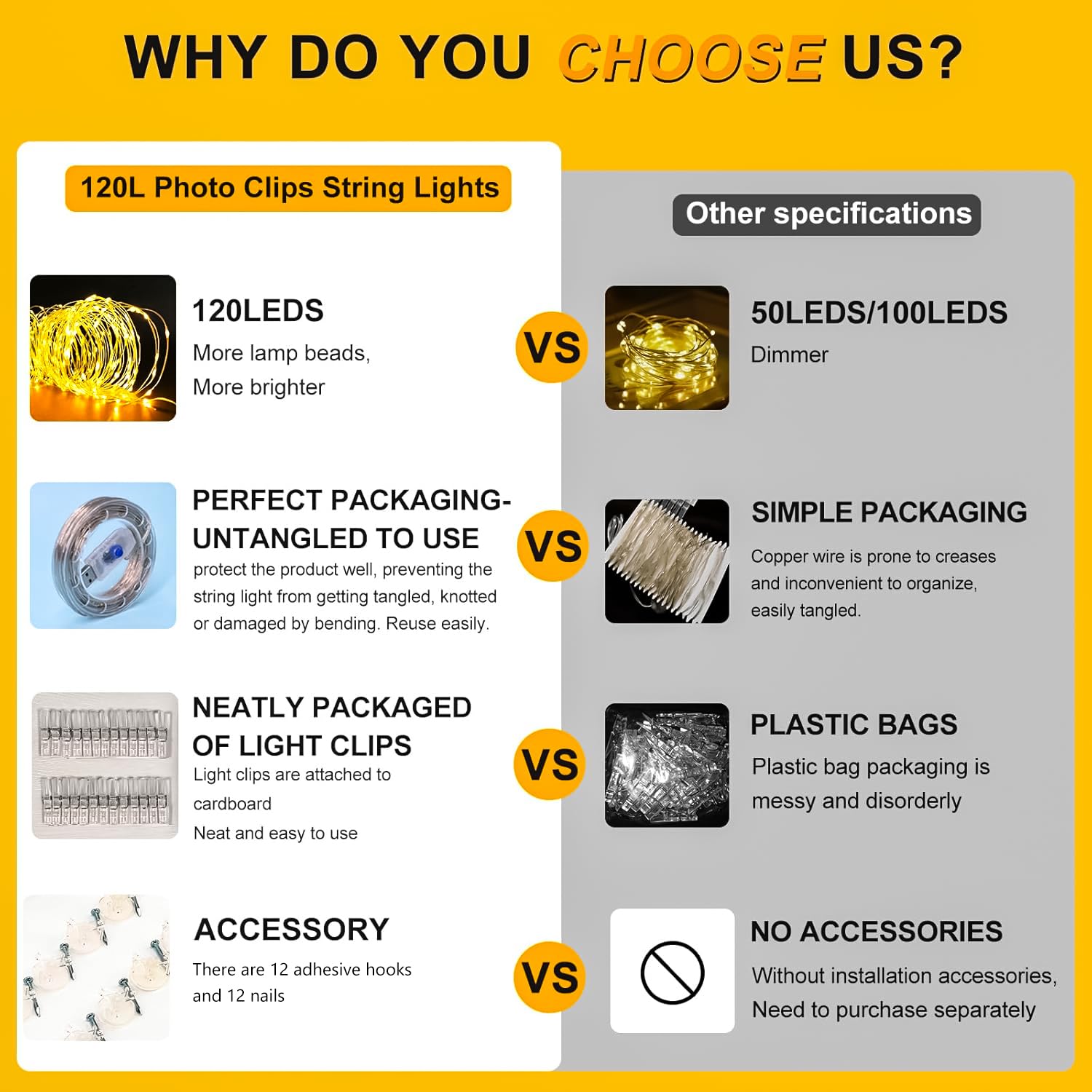 • Upgrade 120LED Photo Clips String Light: Our Copper Wire Fairy String Light have 120LED; Total 40ft long with extra 10ft long power cord; And 10cm distance between LED bulbs, allowing you to free adjustment any sizes on the led string lights for picture