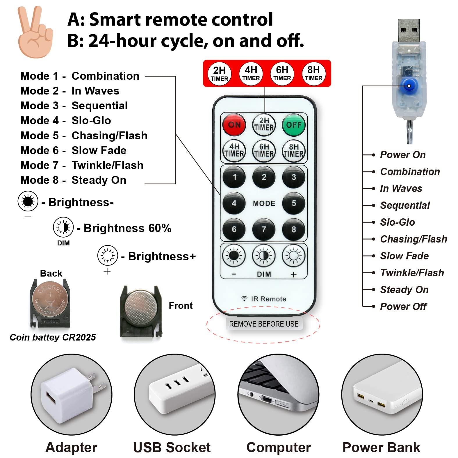 • 8 MODE, Time and Levels Dimmable: Controlled Easily with a Wireless remote a distance of 10 to 15 meters, aim at the USB receiving direction when you press; Both you can turn on the timer function and get a 6hrs on and 18 hrs off to choose the time you want and adjust the brightness of the lights by pressing 'dim-' Or Press 'dim+' , that give you more choices for your night
