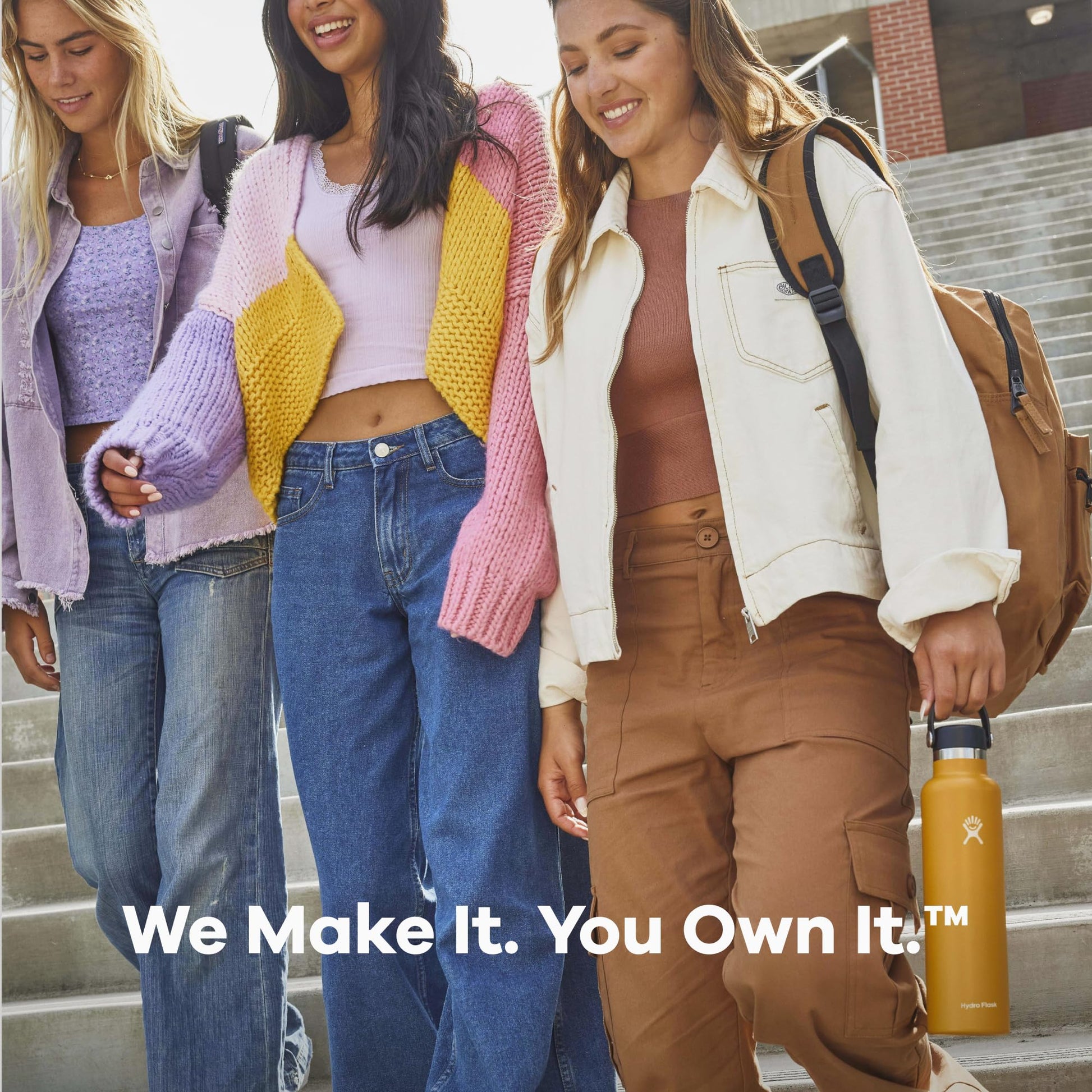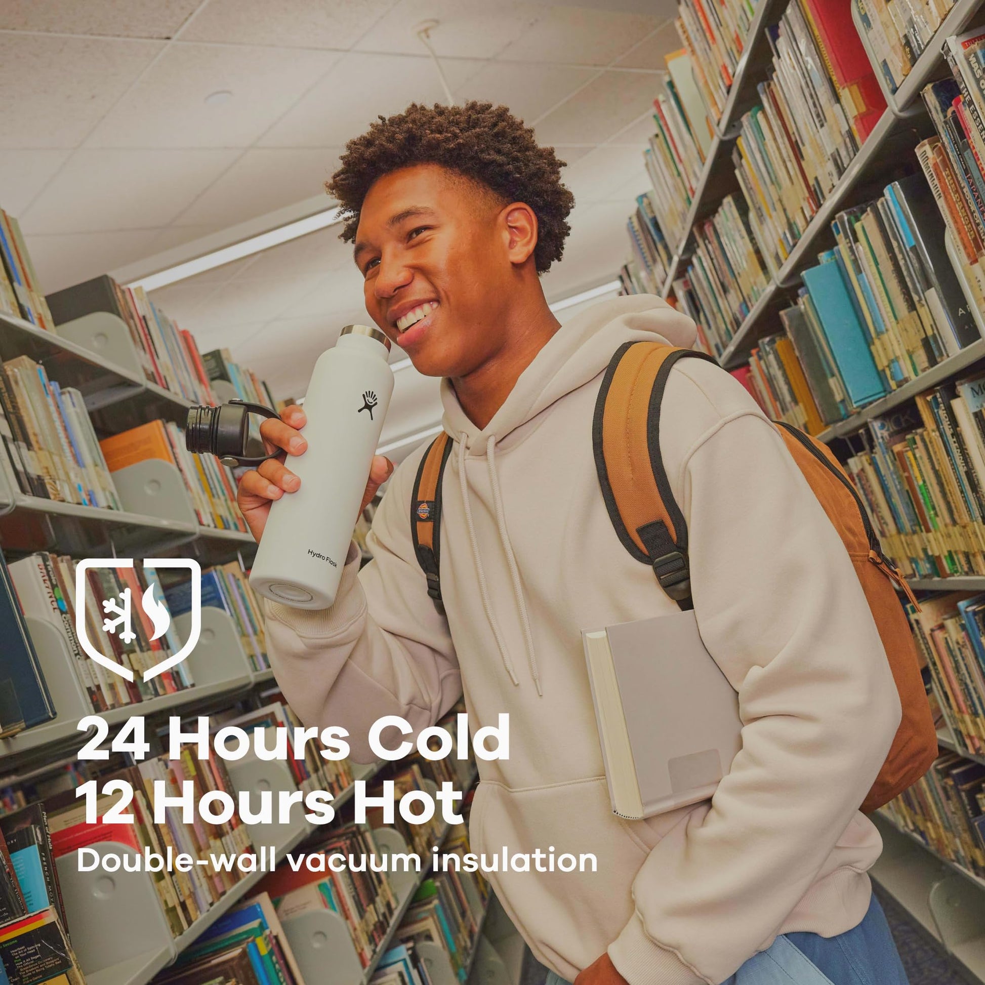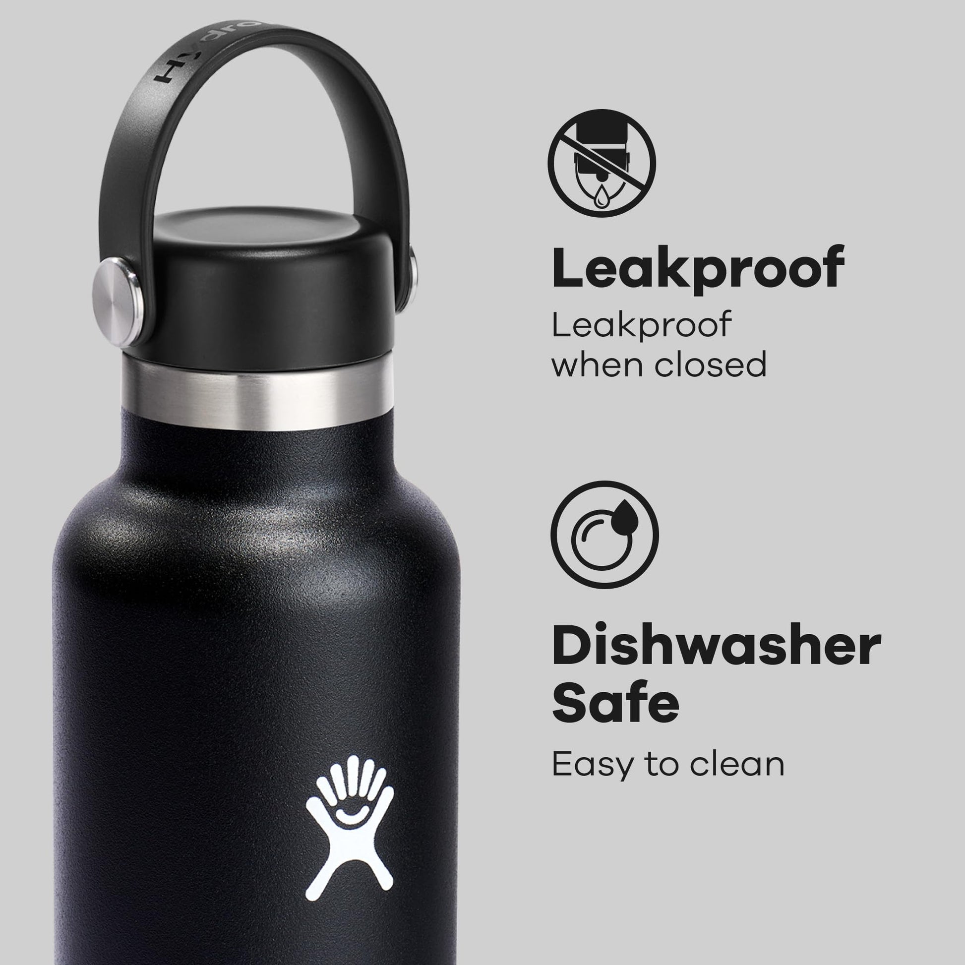 Details: Stay hydrated with the Hydro Flask 24 oz Standard Mouth Bottle. With a comfortable, flexible handle, the reusable water bottle is leakproof with double-wall insulation to keep drinks cold up to 24 hours and hot for up to 12 hours. The insulated bottle easily fits ice cubes and is dishwasher safe. 24 hours cold. 12 hours hot. TempShield® double-wall vacuum insulation. Leakproof when closed. Won't retain odor or leftover flavor. BPA-Free. Dishwasher safe. Easy to clean by hand or dishwasher. Stays clean and colorful. Not for use on a stove, in a microwave or freezer. Keep hot drinks out of the reach of children. Bottle fits all Standard Mouth caps and lids, including the leakproof Flex Straw Cap.