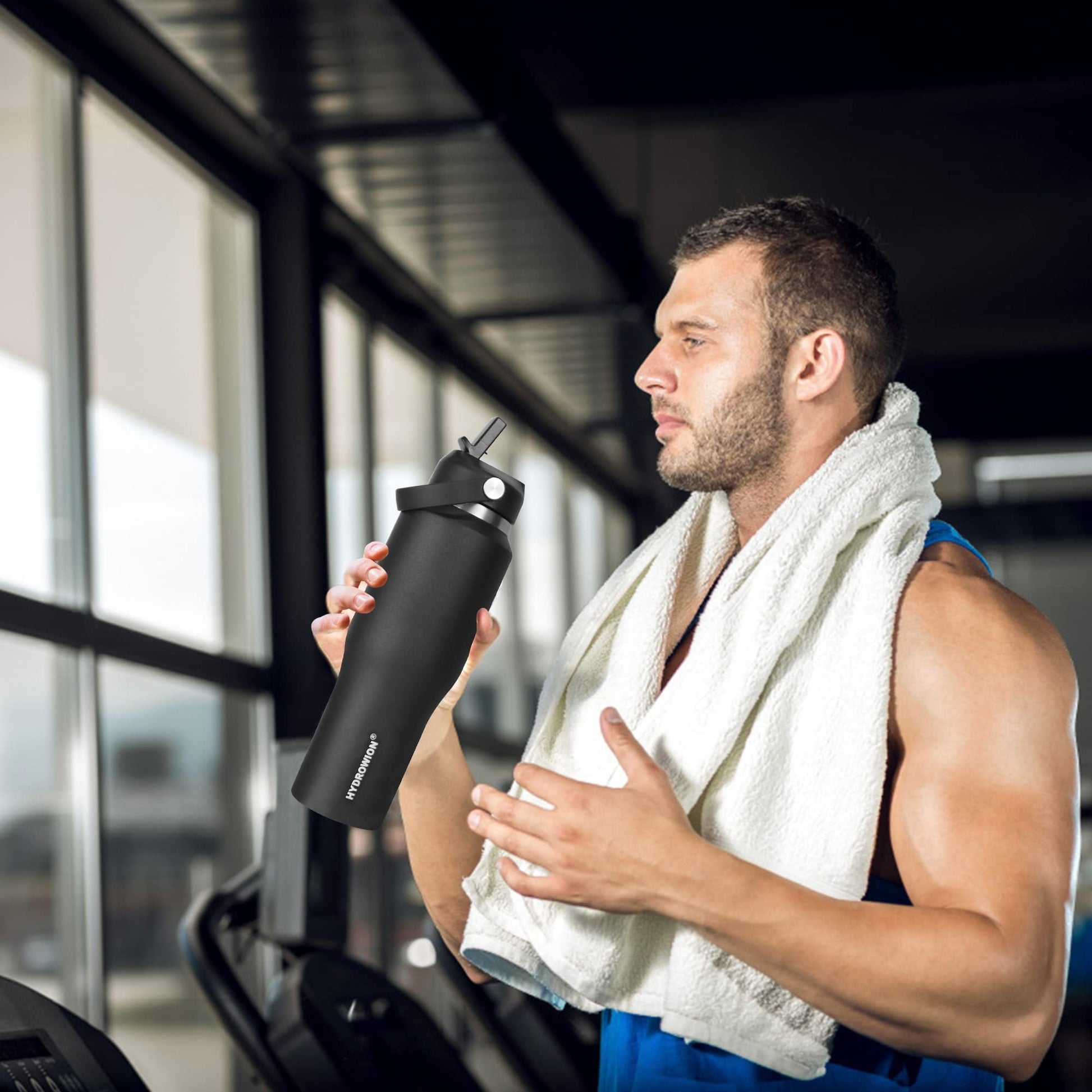 HYDROWION 32oz Stainless Steel Water Bottle(Cold for 48 Hrs, Hot for 24 Hrs),Double Wall Vacuum Insulated Water Bottle with Straw Lid, Spout Lid and Flex Cap, Fit in Any Car Cup Holder,Black