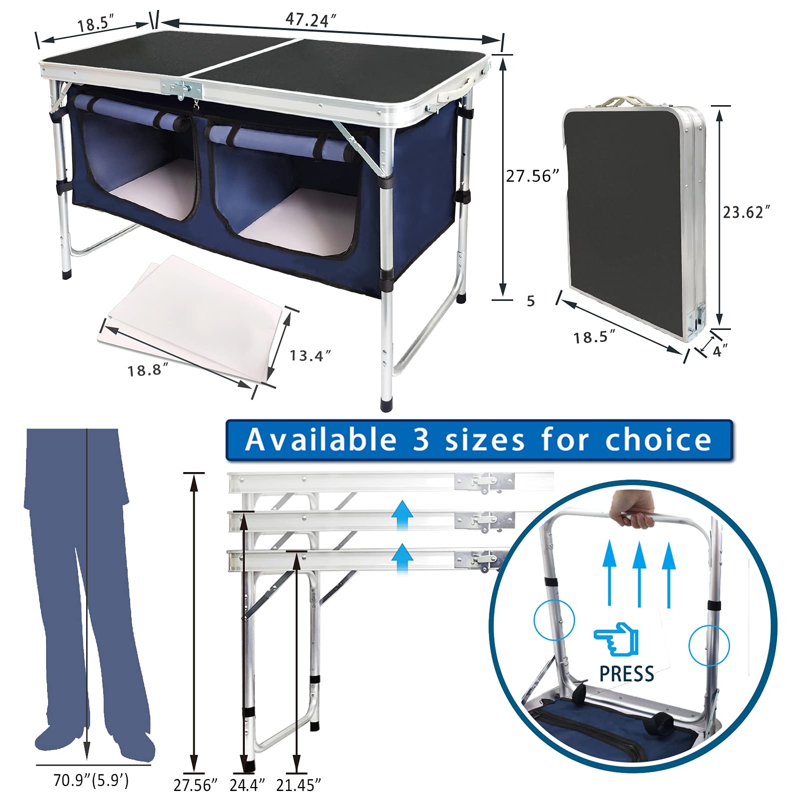 • Easy to set easy to fold: The folding table comes with quick set up and takedown table top, minor assembling steps of two storage bags. Super easy to adjust the camp table’s height by pressing the bush button, 3 height settings suit a diverse range of tasks.