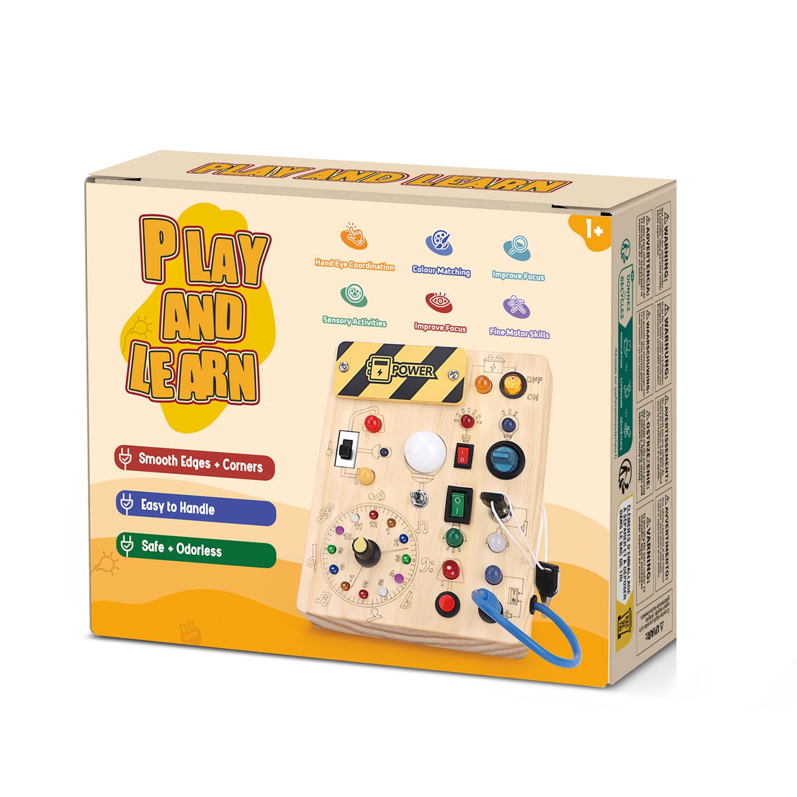 Iabedi Busy Board, Montessori Toy for 1-3 Years Old, Wooden Toddler Sensory Travel Toy, Ideal Gift for 1+ Year Old Boys (Busy Board Plus V2), Medium, Yellow