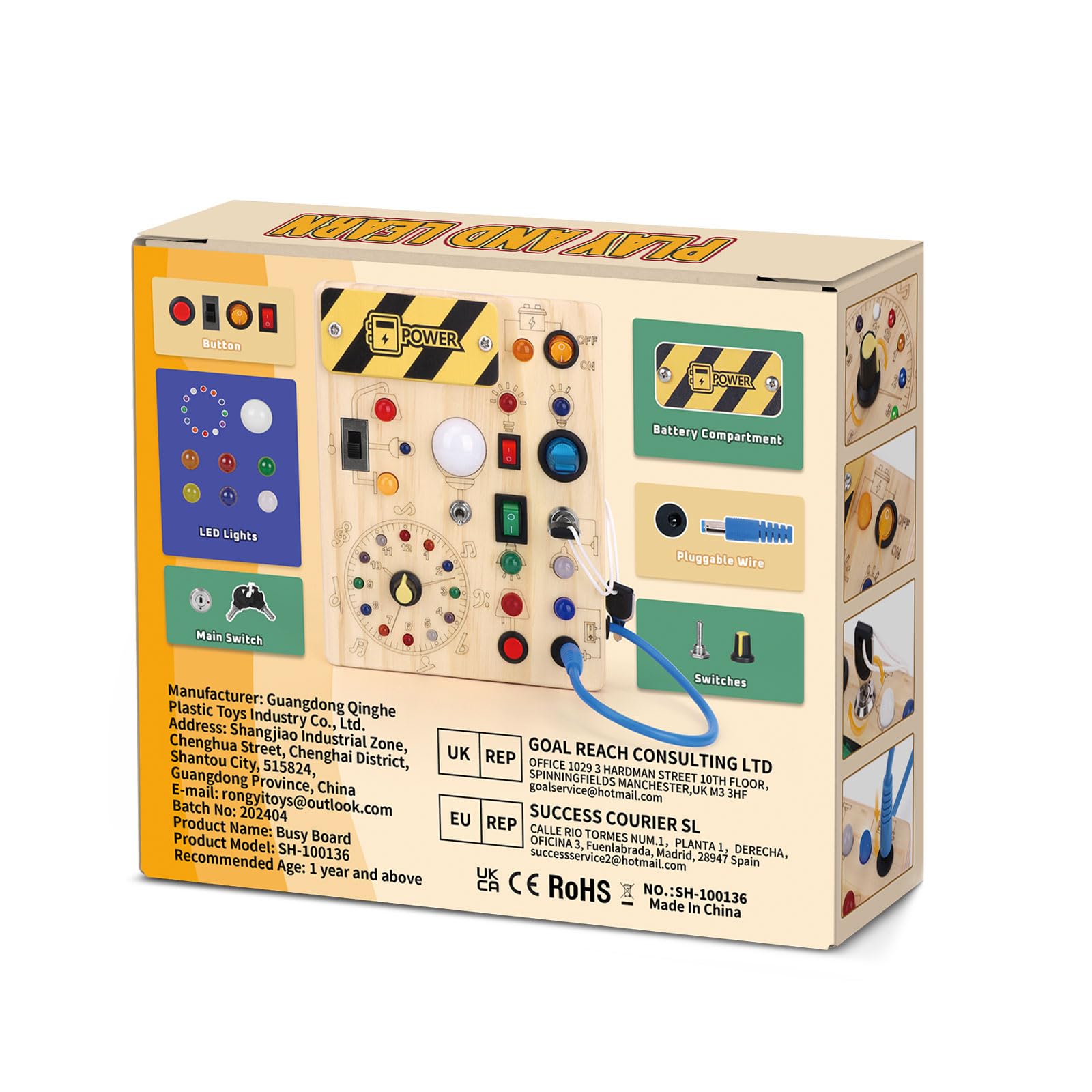• Elaborate Design - This busy board is made especially for young children who like playing with switches and LED lights. On this busy board, there are 10 separate switches, and each switch relates to a different color or style of LED light. Each LED's brightness is set to be just right for the infant-not too bright, blinding, or dark to see well.A master switch is set up to turn off all LED lights with one click to avoid wasting power.