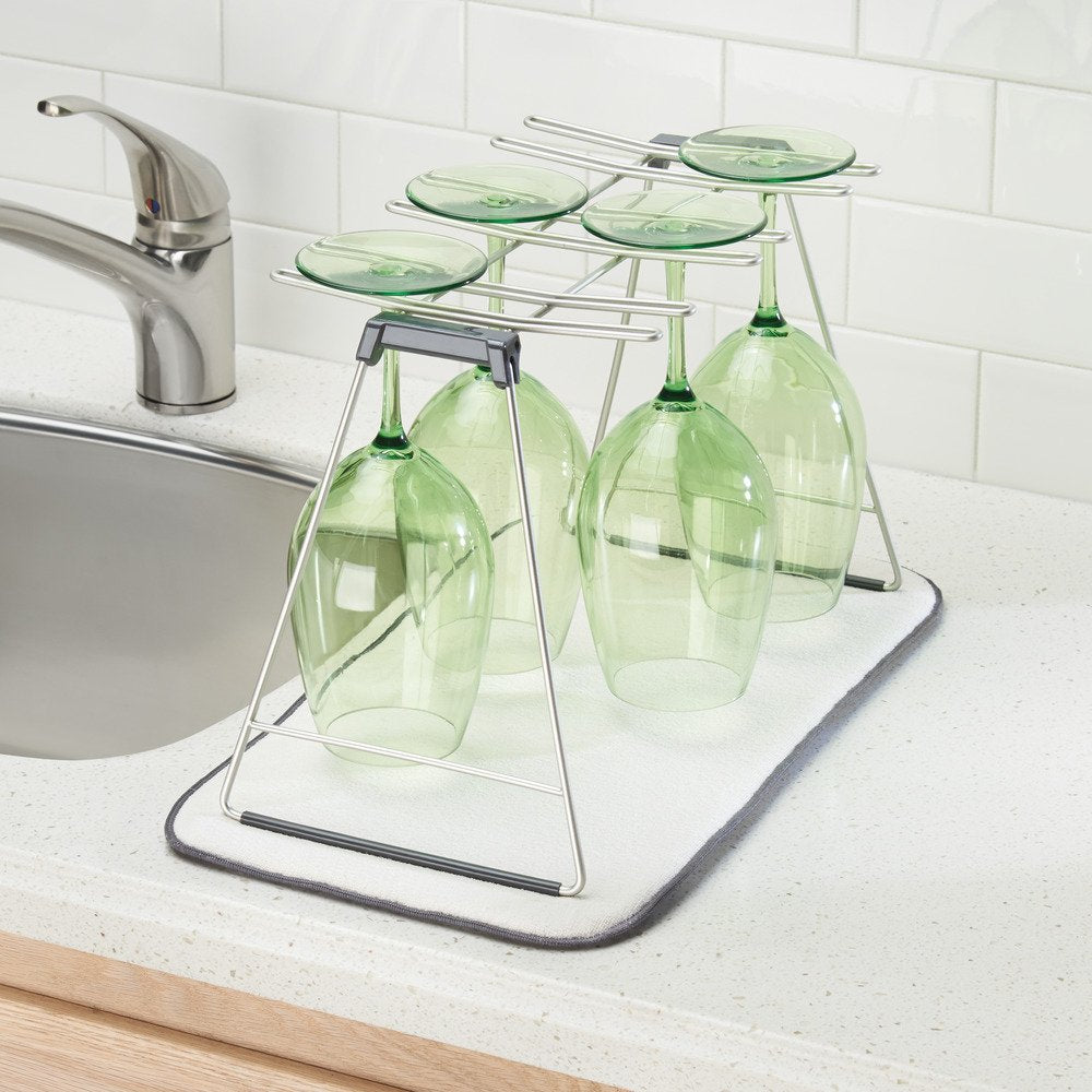 Details: The InterDesign Reversible iDry Mat features two-sides for improved drying capabilities. This mat is an absorbent kitchen companion that catches drips from underneath your dish rack, keeps the counter from being scratched and cushions your stemware and dishes.