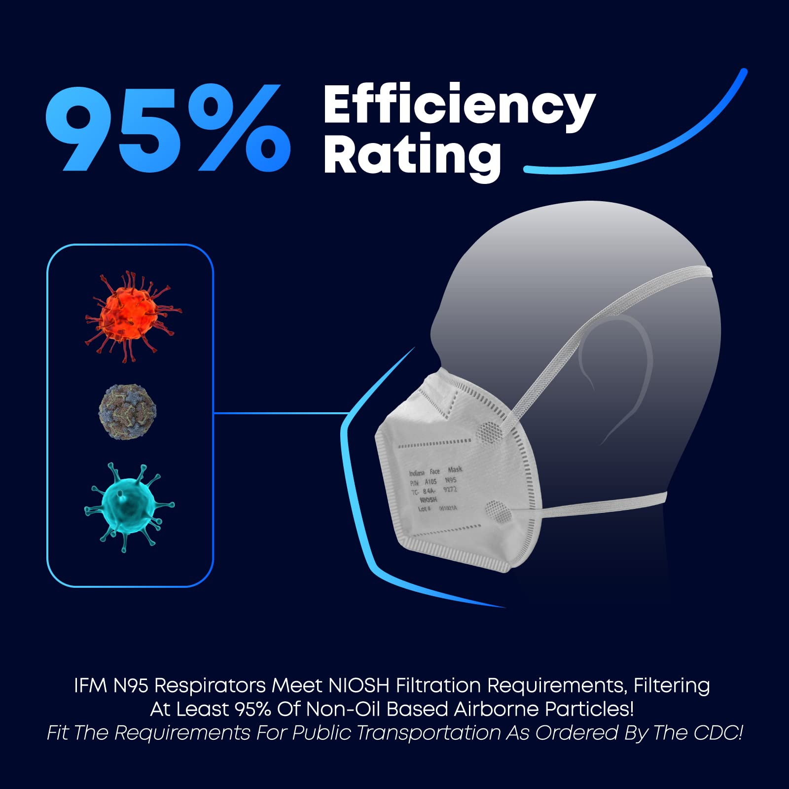 Details: NIOSH Approved N95 respirator, Box of 25 - Individually Packaged. Indiana Face Mask N95 respirators are ideal for daily use as they are individually packaged and lightweight, allowing for longer wear time. The adjustable nose clip will help provide a custom fit and secure seal to help reduce wearer exposure to pathogenic airborne particles. Our N95 respirators meet NIOSH filtration requirements, filtering at least 95% of non-oil based airborne particles. (Title 42, Code of Federal Regulations, Part 84 (42 CFR 84), [Approval Number: 84A-9272]) Indiana Face Mask N95 Particulate Respirators are made with the consumer's safety and comfort as our top priority. We make every part of our masks and respirators in Rensselaer, Indiana USA! IFM A105 N95 Respirators are latex-free. Each box contains 25 N95 Respirators.