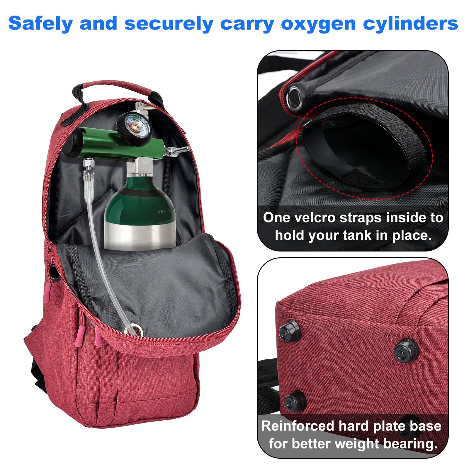 • Securely Hold O2 Tanks: The material of our oxygen tank holder is comfortable to wear, there are two velcro straps inside to fix the oxygen cylinder in place. And the layer of plastic reinforced hardboard at the bottom to withstand the weight of the oxygen tanks.