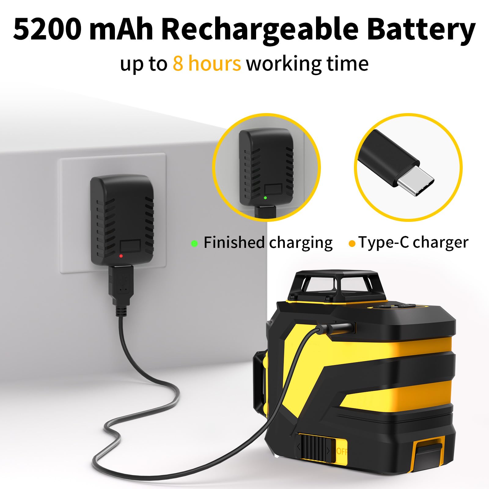 • 5200 mAh Large Capacity Battery: The line lasers is equipped with a large-capacity battery, which can working up to 8h; When the battery power is low, the battery indicator will turn from green to red, IKOVWUK also comes with charger, charger indicator on red - charging, charger indicator on green - charging completed