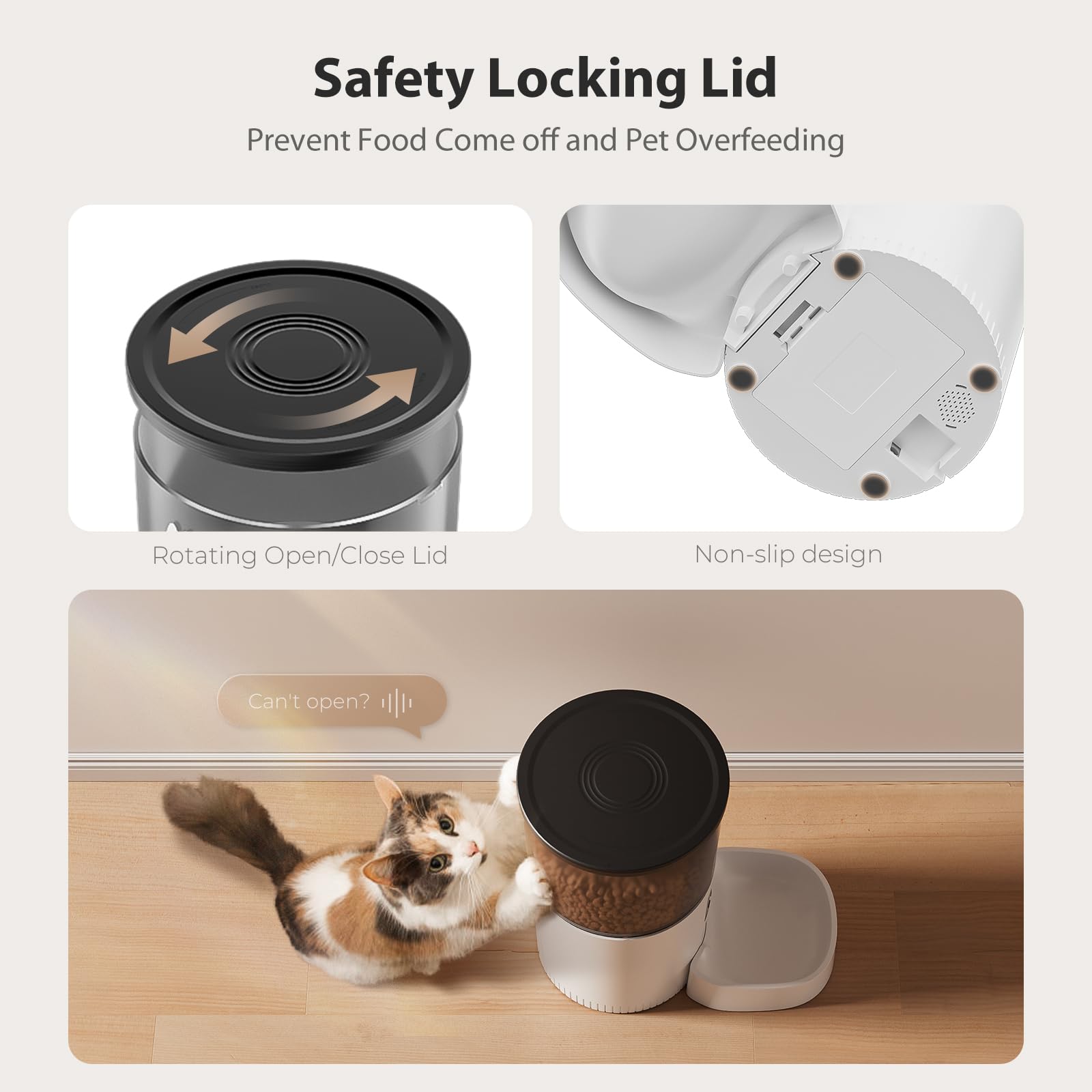 • Easy to Use & Maintain: IMIPAW Auto Cat Feeder inbuilt LCD screen allows quick setup and press both UP & DOWN together to manually dispense 1 portion; Proper angle so that food will not accumulate in the food outlet, and the cat food tray are removable for cleaning. The secure lid lock design prevents pets from getting food