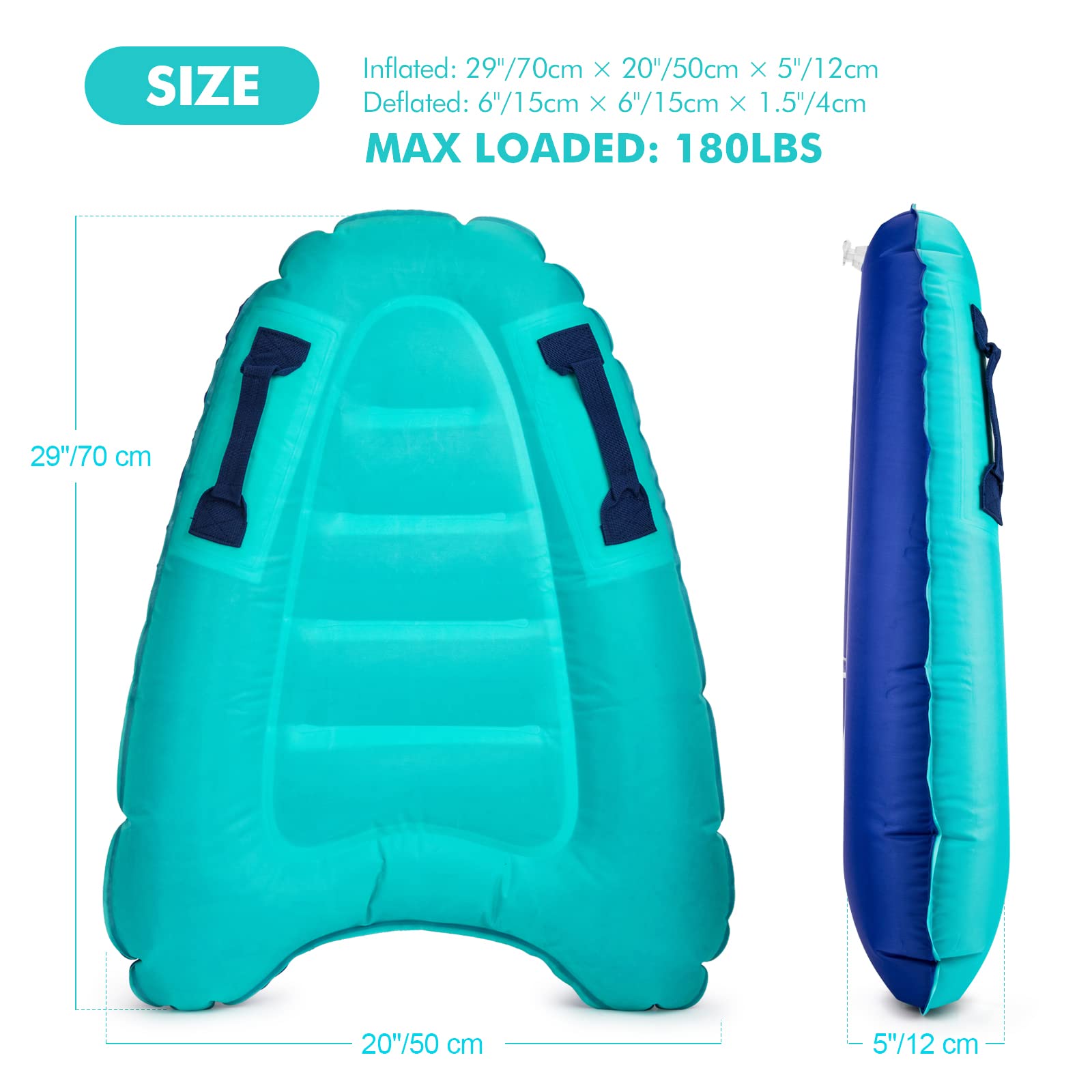 • Large Buoyancy : This surfing Body Board is made of high density buoyant fabric and double anti-leakage nozzles, will provide long time and safety uses for your kids, The air will stay for more than 1 month if you do not deflate it, can be used as Slip and Slide Water Game Pool and Beach Floating Mat or learn to swim kickboards which produces large bouyancy and loads kids and adults up to 180 lbs.