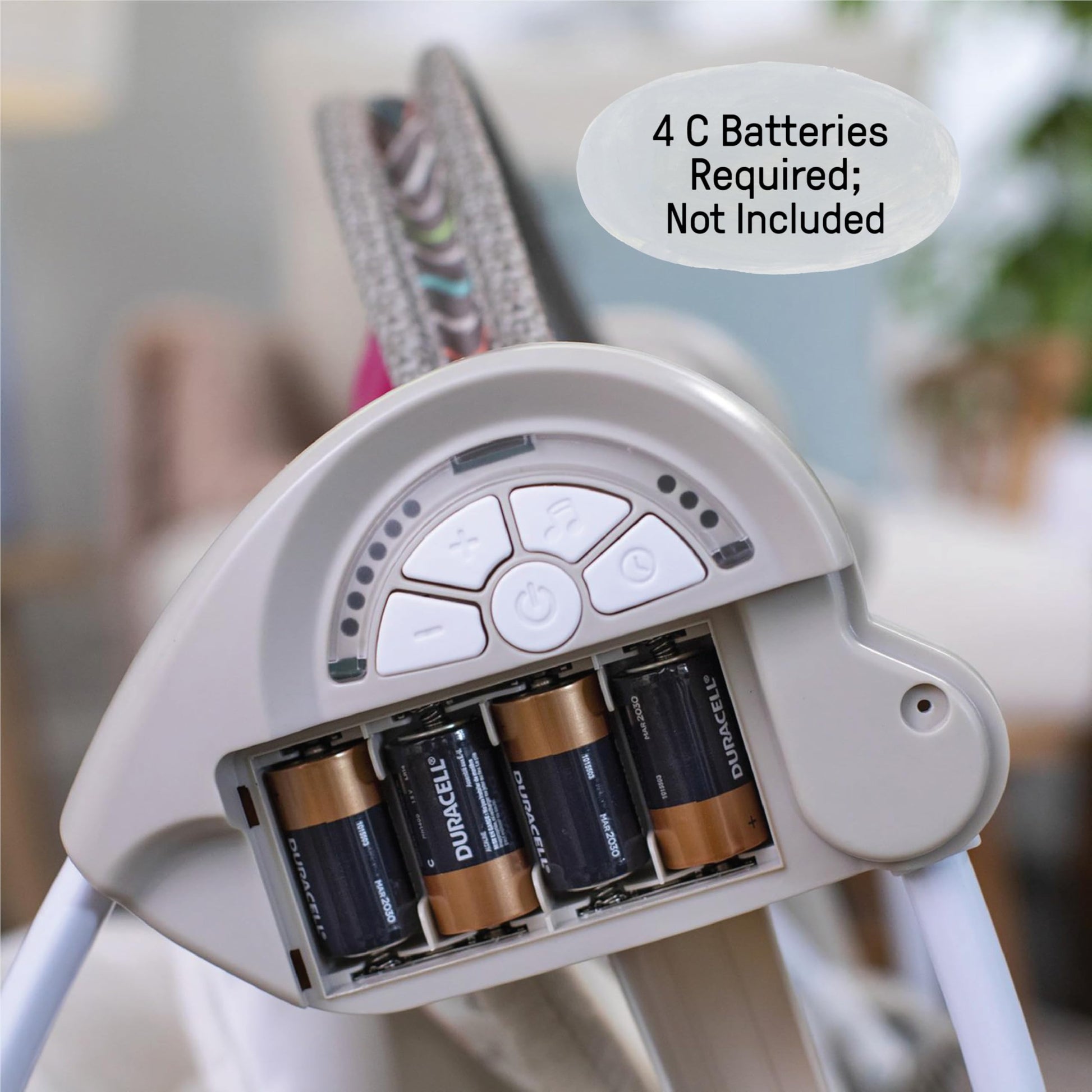 • Folds up for compact storage; easy travel to grandparents’ house and beyond; removable toy bar with 2 plush toys for easy access to baby; powered by 4 C batteries (not included)