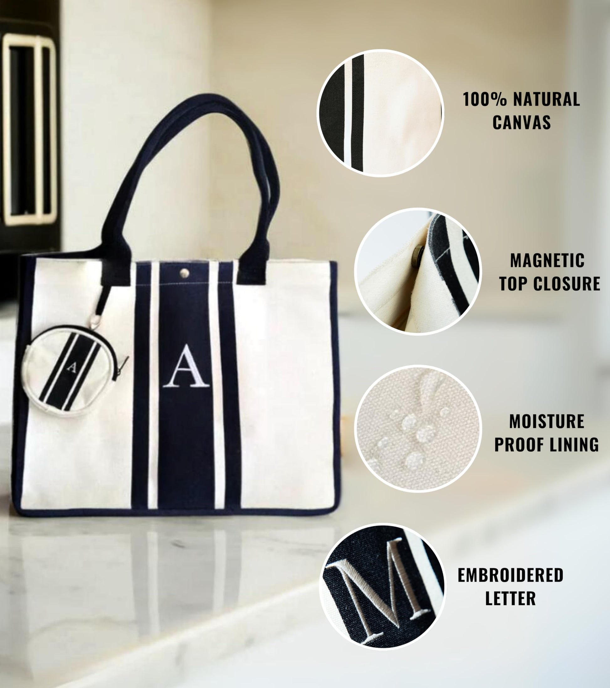 • Durable Canvas Tote with Moisture-Proof Lining and Accessories Pouch – Crafted from thick 12oz canvas with reinforced handles, a structured base, and a moisture-proof interior liner to protect your belongings. Includes a matching A-initial zippered pouch — ideal for travel essentials, cosmetics, or small electronics