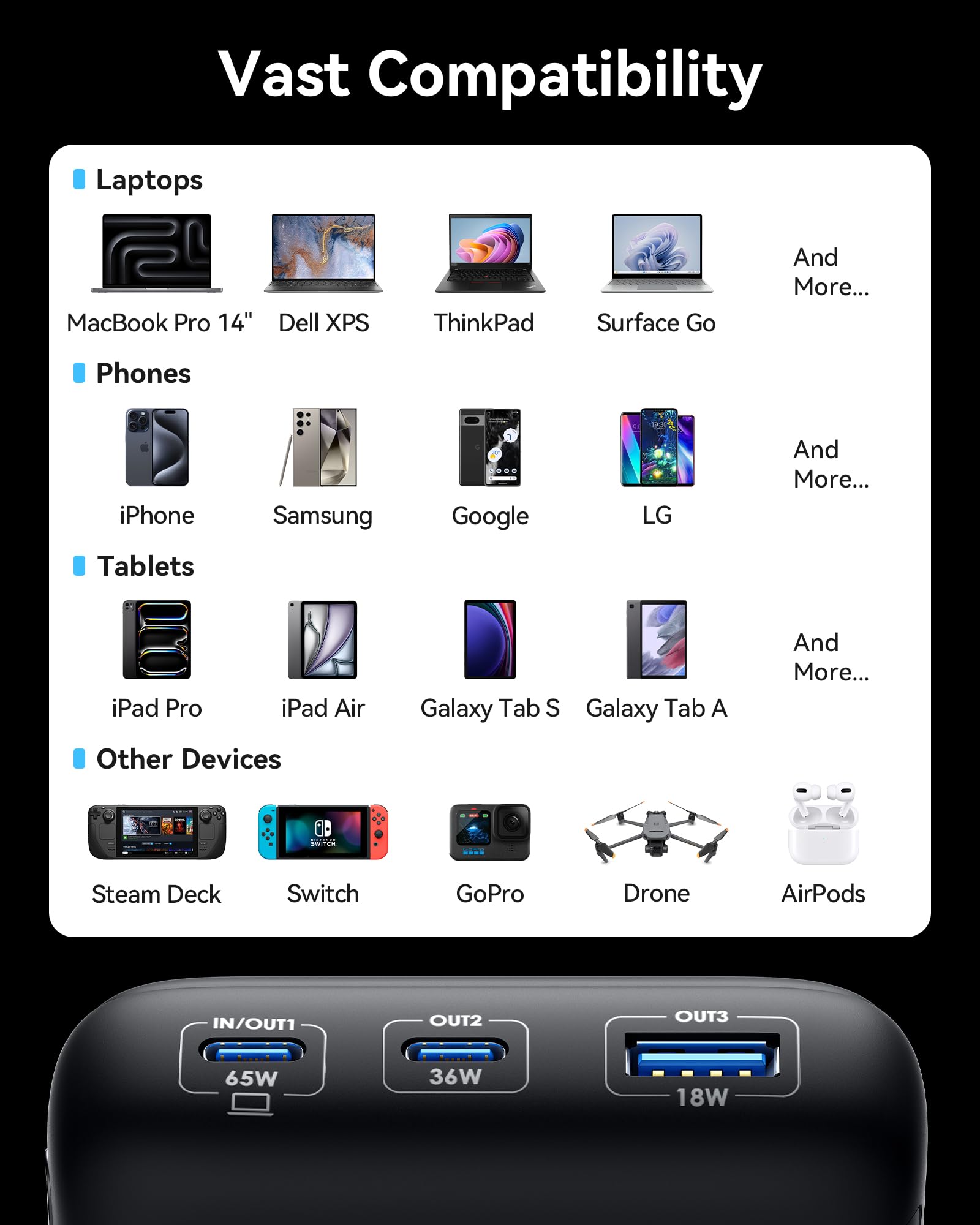 • [Charge 3 at Once] With 3 charging ports, including a blazing-fast PD 65W USB-C out port, a PD 36W USB-C fast charging port, and a trusty USB-A port, this power bank is your all-in-one charging solution. It works seamlessly with various cable types, ensuring rapid charging for all your devices.