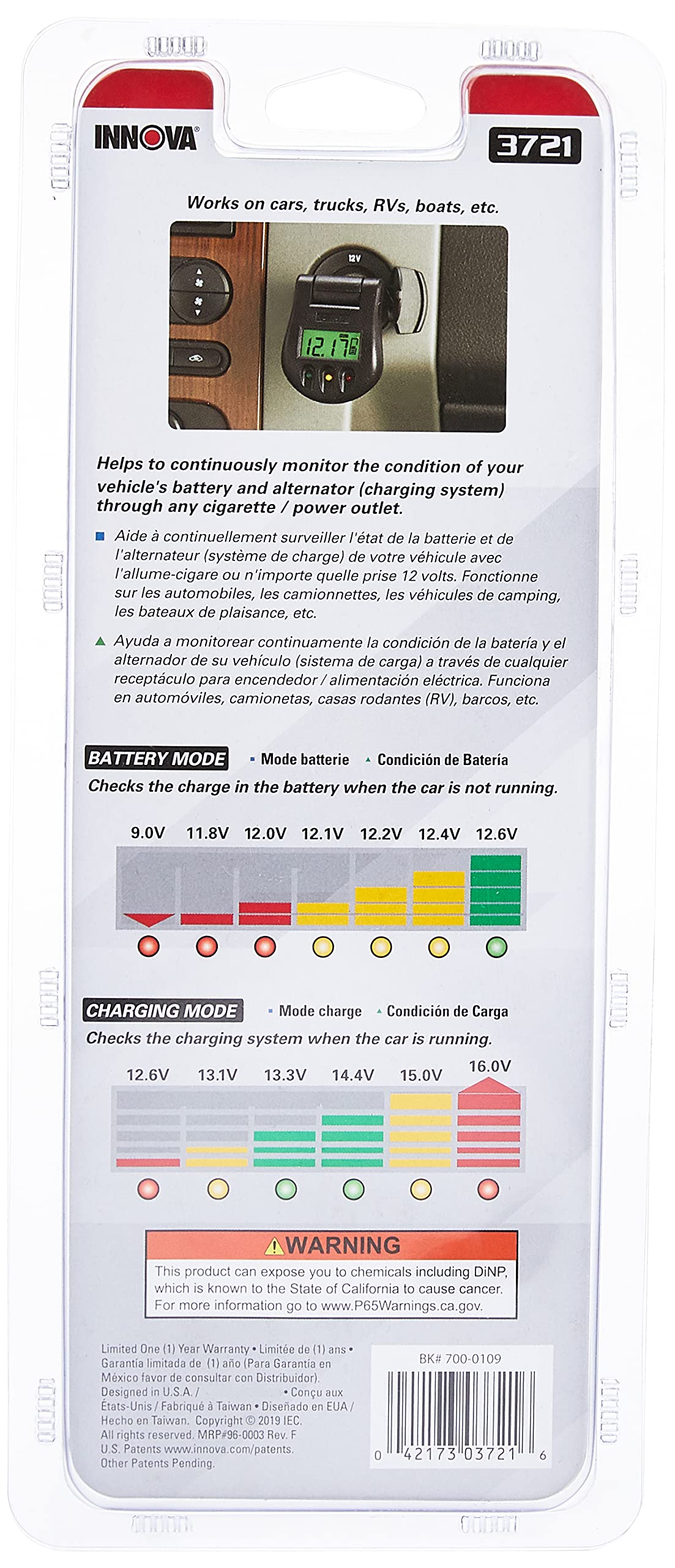 Details: The INNOVA Battery and Charging System Monitor displays the condition of your battery and charging system instantly. It protects the engine computer and 12-volt accessories from damaging surges when jump starting or recharging. Easily plugs into the vehicle's cigarette lighter or power receptacle to monitor battery and charging system voltage. The LCD screen displays the measured voltage with a bar graph to indicate battery charge level and the color-coded LEDs quickly identify the battery's charge status. The head pivots for easy viewing and angle adjustment.