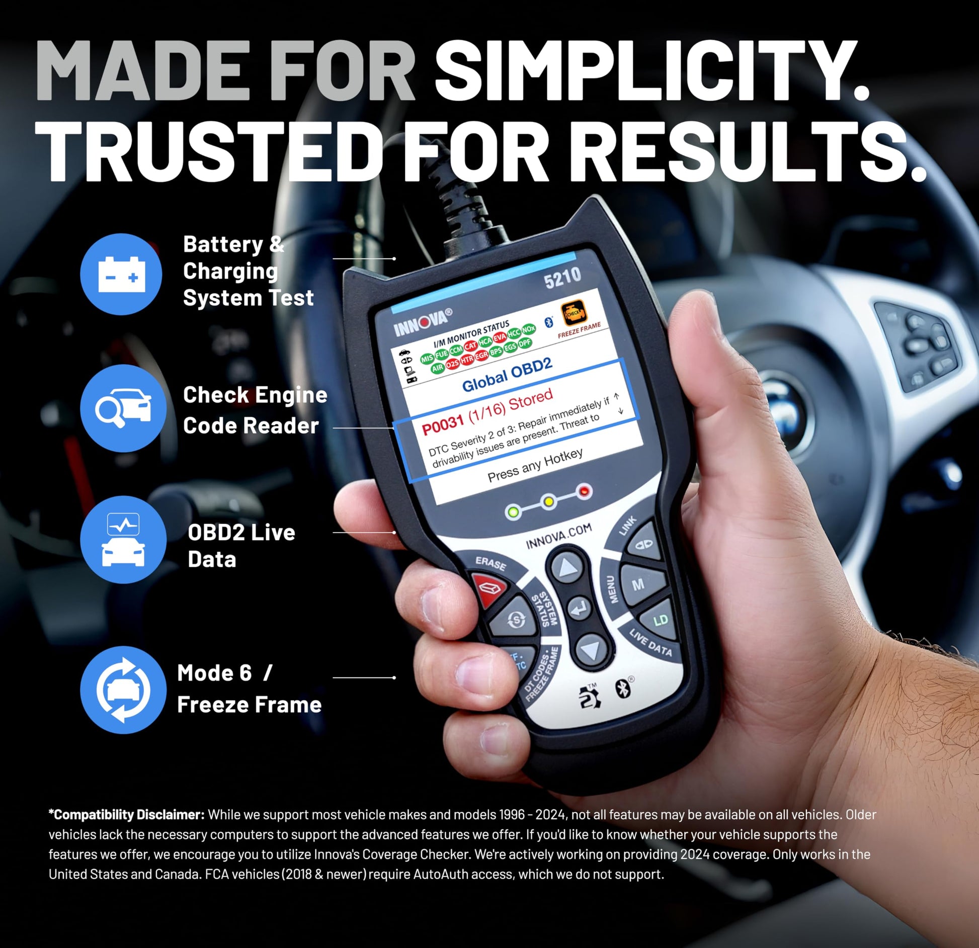 • OBD2 SCANNER & BATTERY TESTER IN ONE – The INNOVA 5210 OBD2 scanner not only reads and clears check engine light and ABS codes (coverage may vary) but also functions as a car battery tester to check alternator health and prevent unexpected breakdowns.