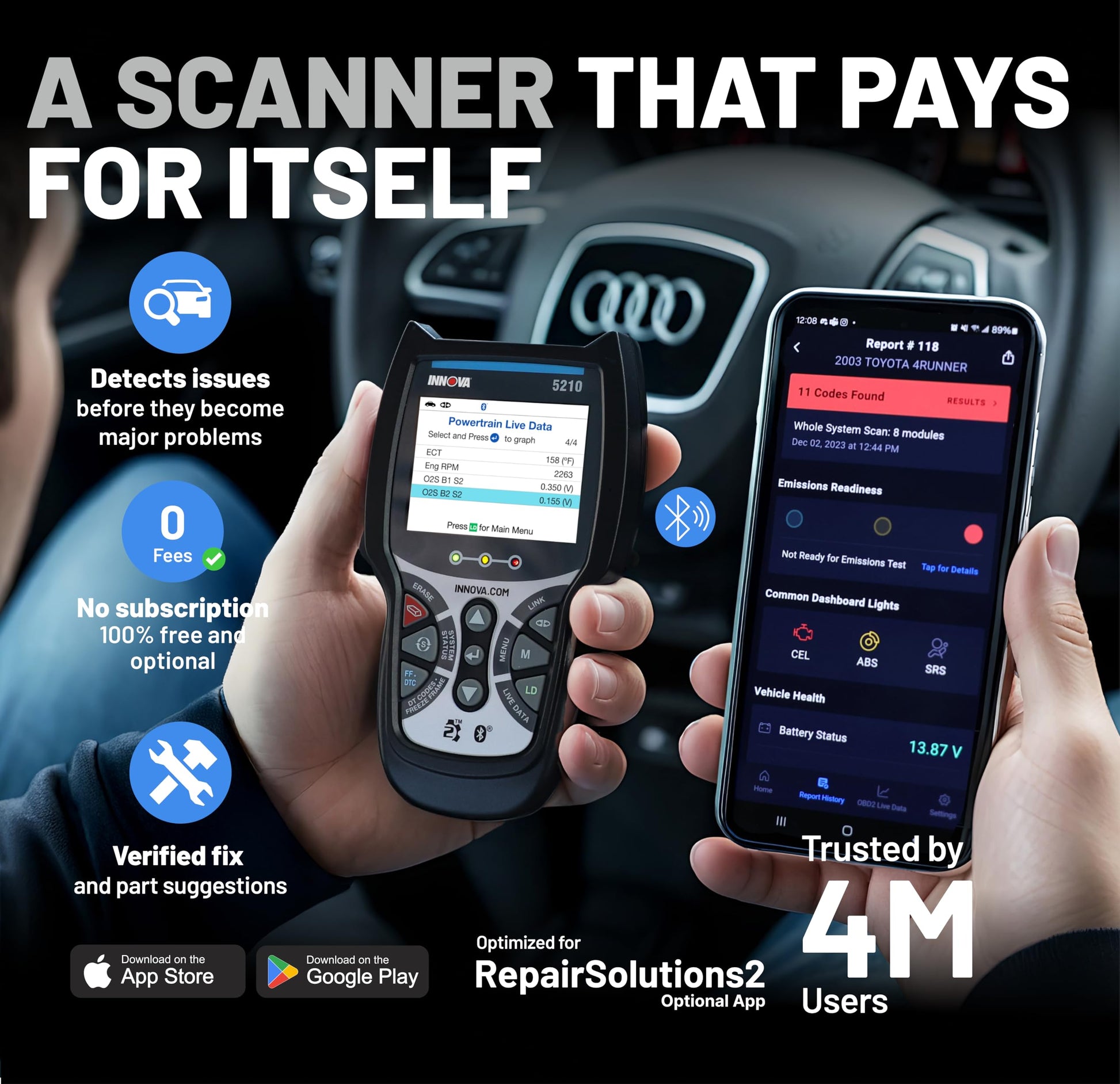 • NO SUBSCRIPTIONS – VERIFIED FIXES WITH FREE APP – Unlike other OBD2 code readers, the INNOVA 5210 provides verified fixes based on real-world repairs from ASE-certified mechanics. Trusted by 4M users, the RepairSolutions2 app on iPhone & Android gives you step-by-step repair guidance, suggested parts, and cost estimates—no extra fees or hidden subscriptions!