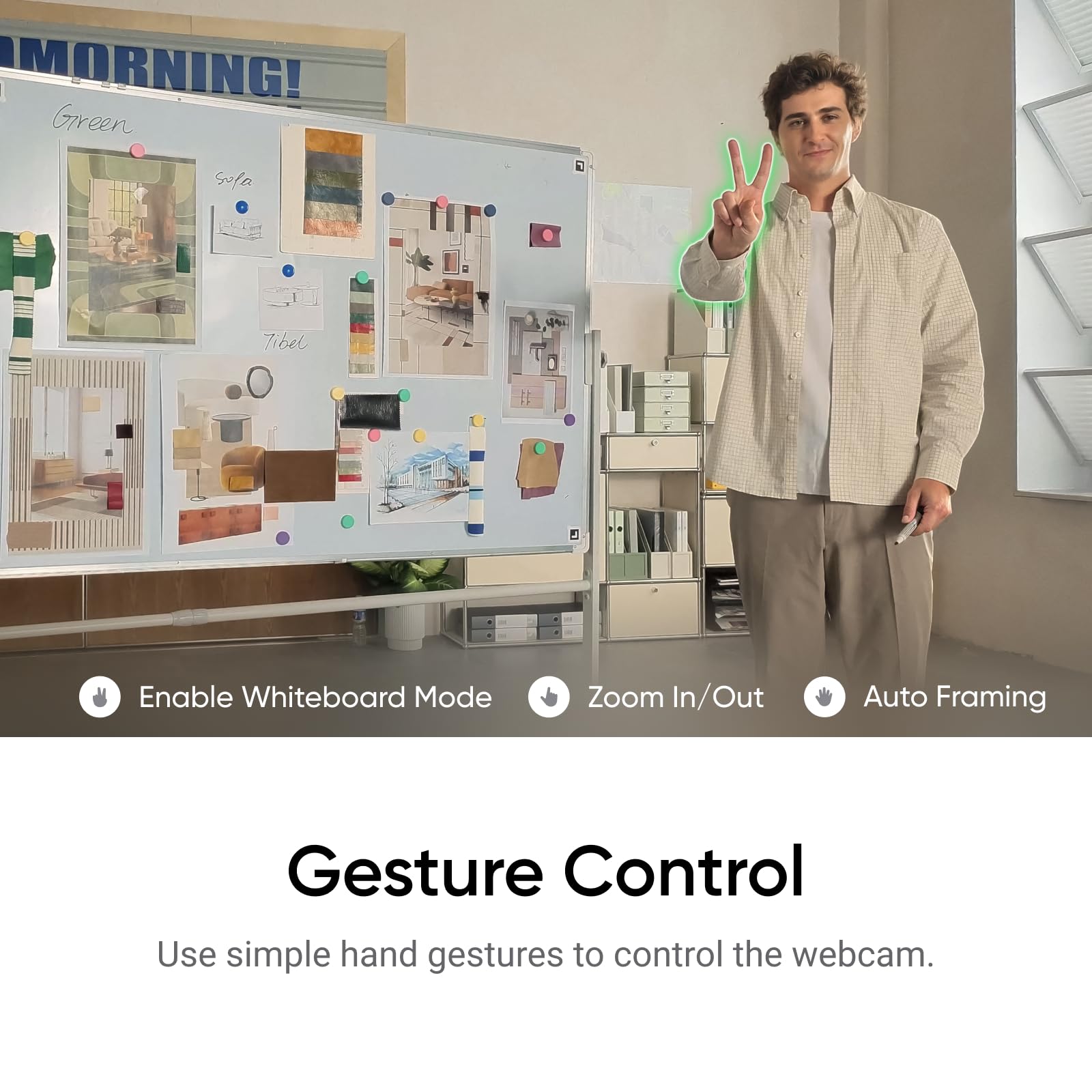 • Gesture & Remote Smartphone Control: Control your webcam remotely from your smartphone, or use simple hand gestures to start AI Tracking/Auto Framing, zoom in or out and activate Whiteboard Mode.