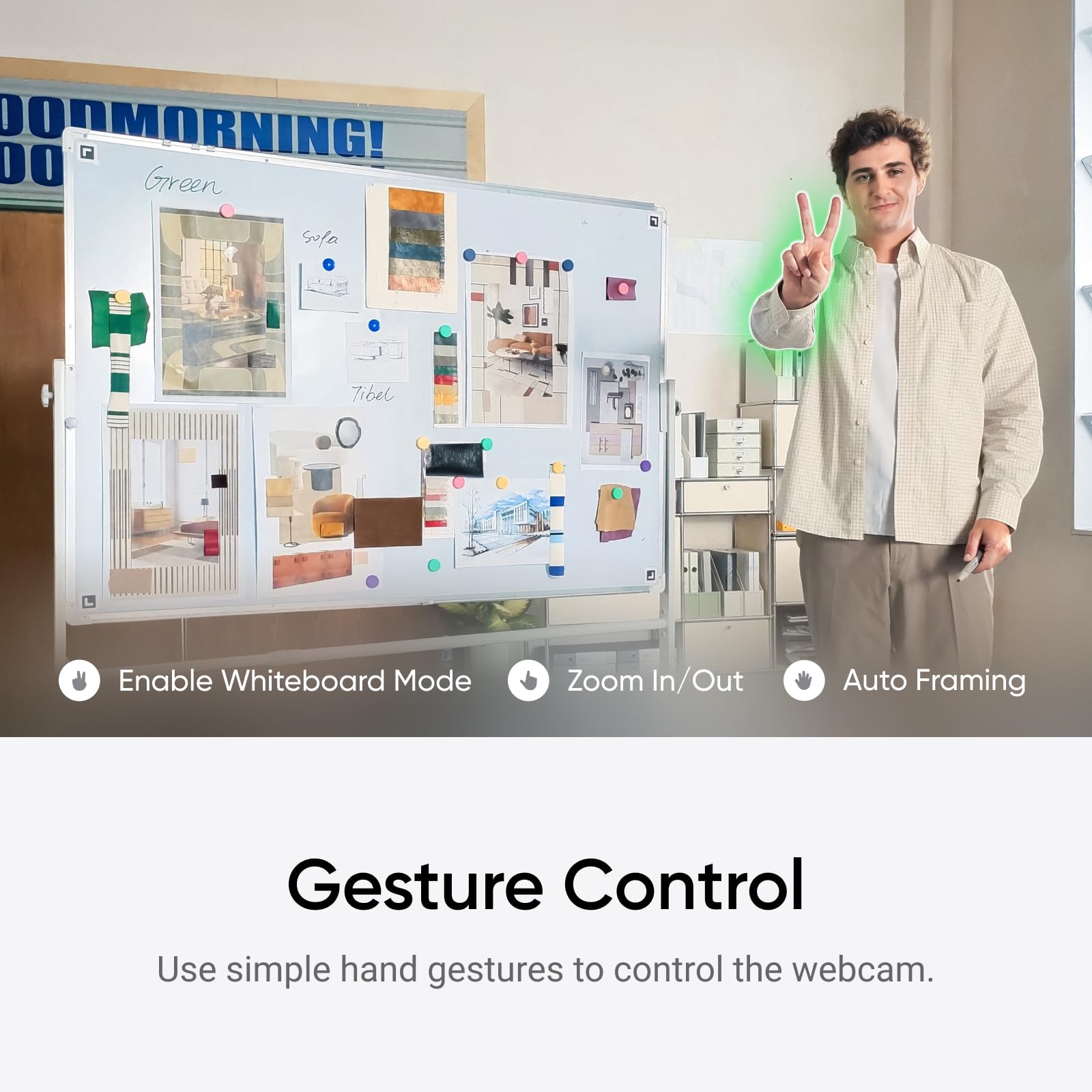 • Gesture & Remote Smartphone Control: Control your webcam remotely from your smartphone, or use simple hand gestures to start AI Tracking/Auto Framing, zoom in or out and activate Whiteboard Mode.