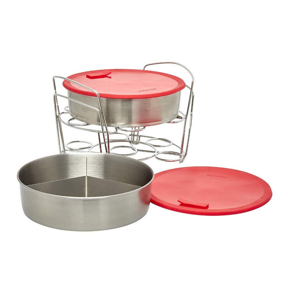 • Complete 8-Piece Set: Includes upper and lower wire egg racks, two silicone lids, stainless steel round pan with removable base, solid bottom stainless steel round pan, and removable divider. Everything you need for versatile cooking and baking.