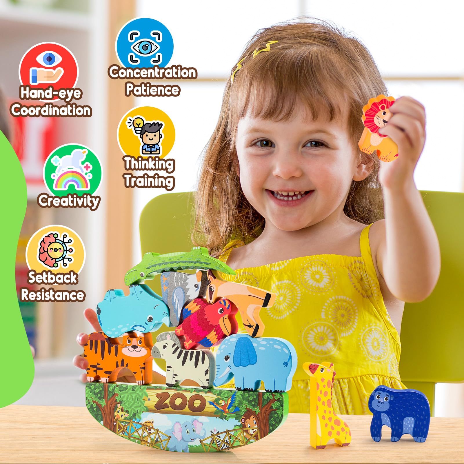 • Animal Stacking Blocks: Come and visit the zoo together! These wooden stacking blocks include 11 colorful cute animals and a zoo theme balance base. The size is suitable for kids aged 3-6