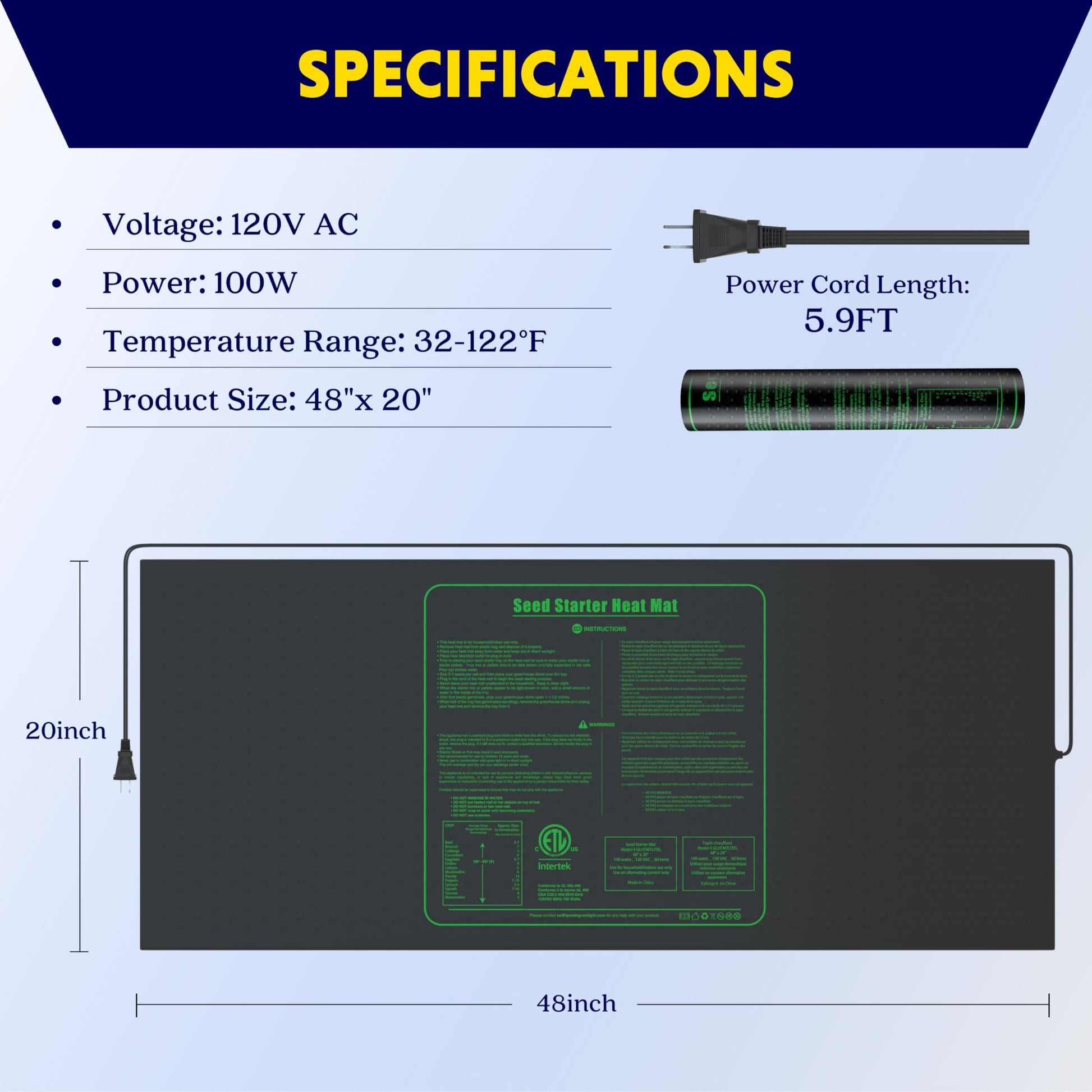 • Heating pad specifications: Size: 48*20 Inch; Wattage: 100W; Voltage: 120V; Material: PVC;Protect cold-sensitive plants and improve plant survival rate.