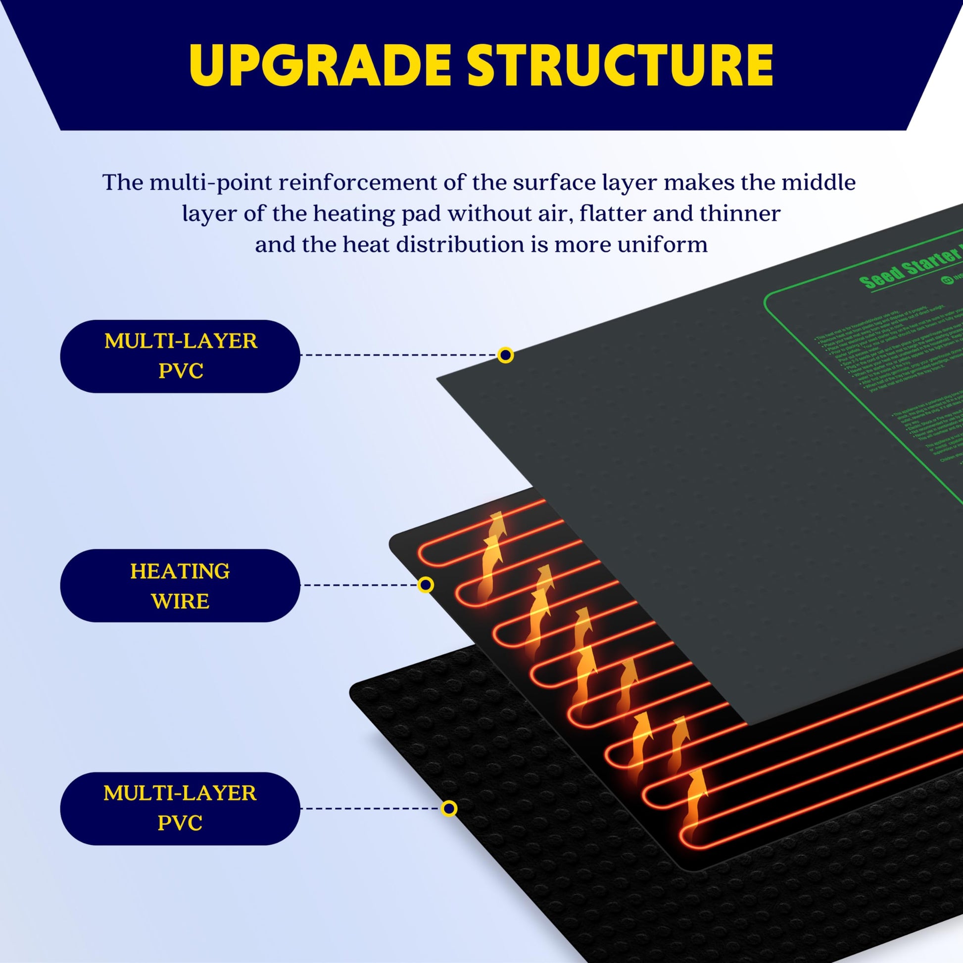 • Upgraded technology: The multi-point reinforcement of the surface layer, the heating mat is lighter, thinner, smoother and has no gaps, the temperature is more uniform, be conducive to the constant temperature growth of plants.