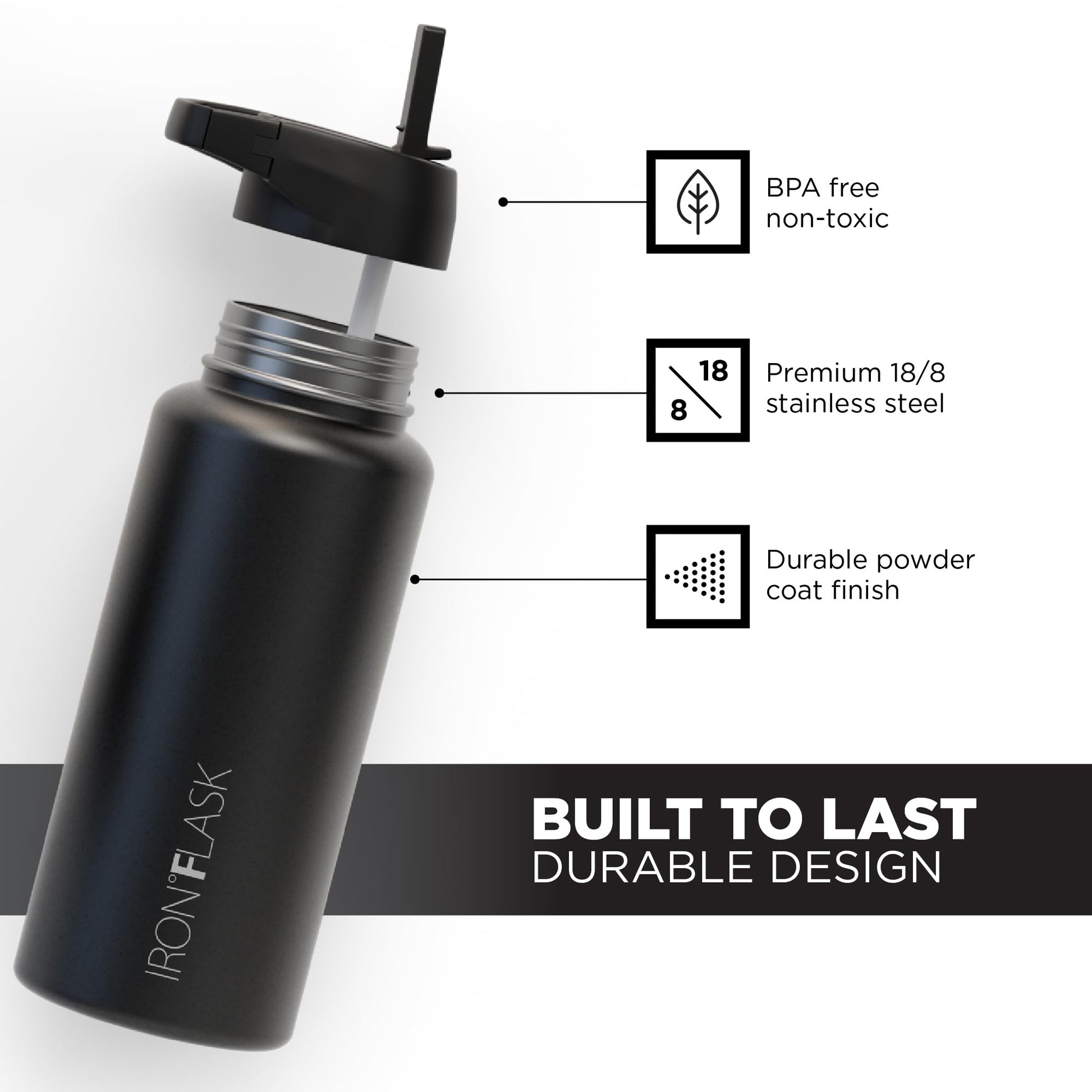 IRON °FLASK Camping & Hiking Hydration Flask with 3 Lids - Stainless Steel, Double Walled & Vacuum Insulated Water Bottle - Leak Proof & BPA Free (Midnight Black, Straw - 32 oz)