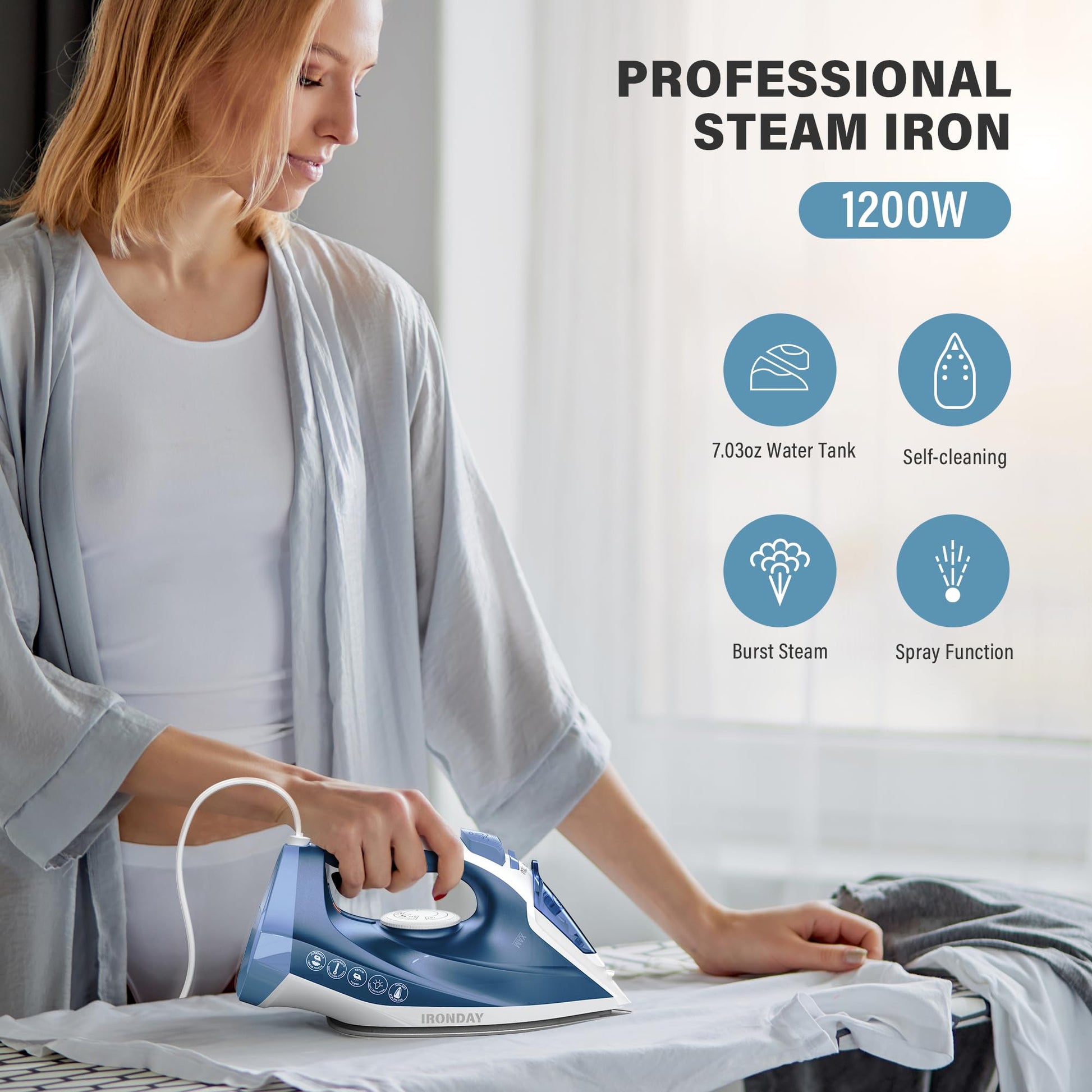 IRONDAY Steam Iron for Clothes Fast Heating, 1200W Iron with Non-Stick Ceramic Soleplate, Self-Cleaning, Burst of Steam, Spray Mist, 7.03oz Water Tank Ironing Clothes for Home, Blue