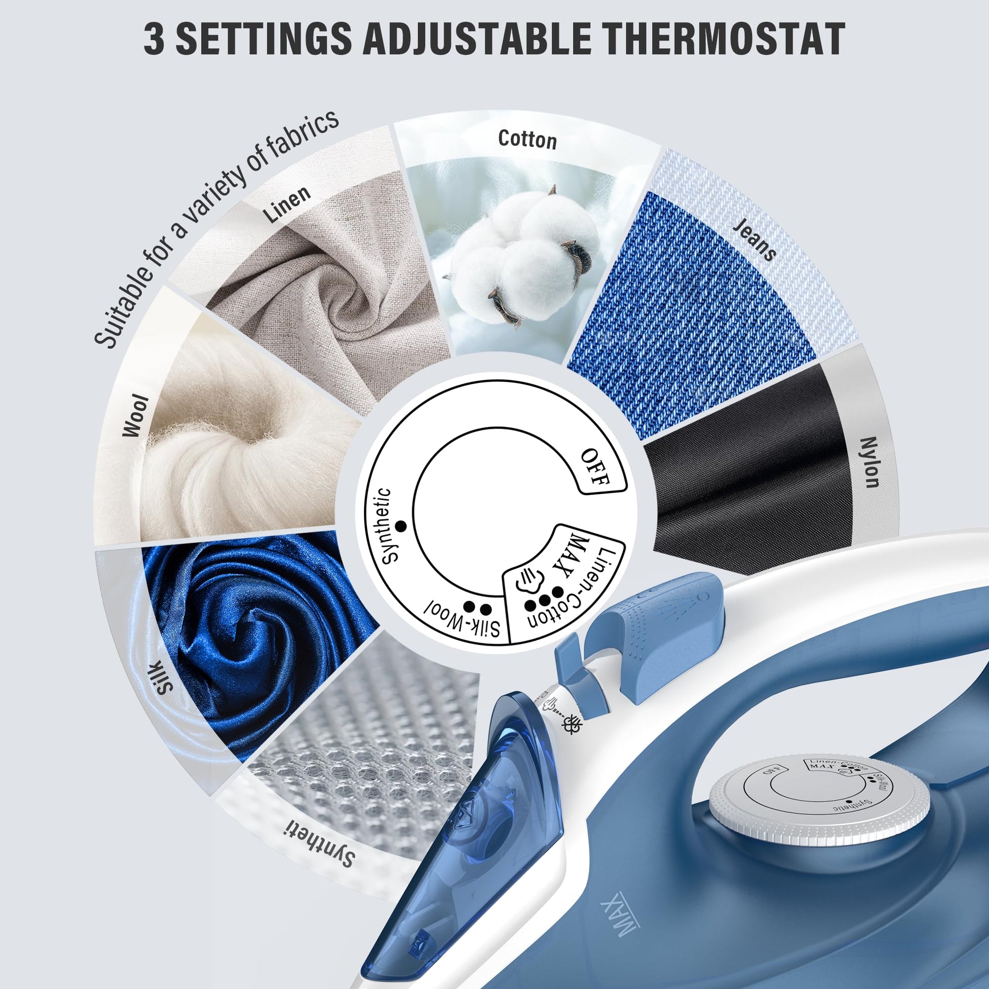 • [Suitable for All Fabrics] You can select the corresponding fabric temperature on the temperature adjustment dial, which is easy to use and control. The clothing iron is suitable for a variety of fabrics, such as cotton, wool, polyester, silk, linen and nylon, etc