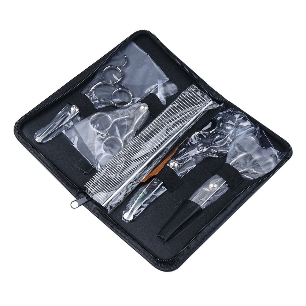 • 【Perfect Pet Grooming Kit】: This cat & dog hair scissors kit includes 1 × 7.3'' thinning shears, 1 × 7.3'' curved scissors, 1 × 6.1'' straight scissors, 1 × 5.3'' straight scissors, 1 × pet comb, 1 × cleaning cloth, and 1 × stylish black leather case. With this dog grooming kit you can trim any part of your pet such as body, face, nose, ear, tail, paw etc.