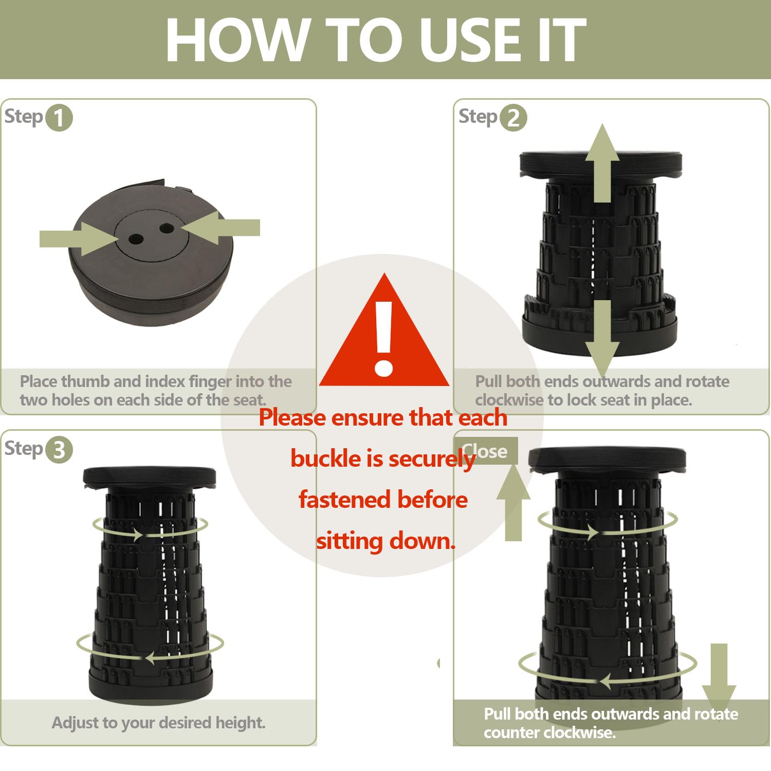 • 【PREVENT SELF-OPENING】When the folding stool is stowed away, the snap designed on the stool cap will work to prevent the stool from opening on its own. The non-slip base ensures the stability of this foldable stool, providing you with a safe and comfortable sitting position.