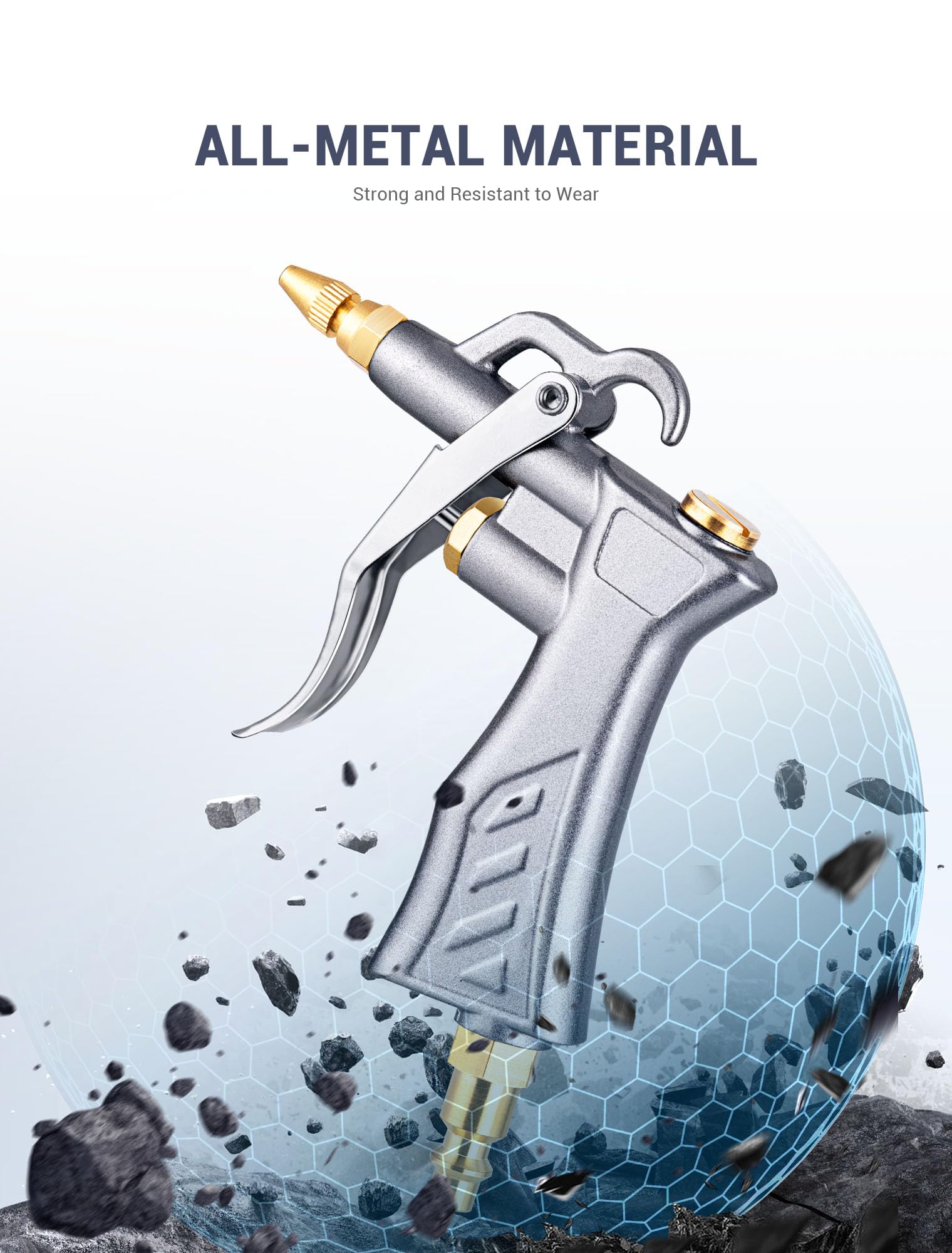 • All metal construction, high pressure resistance copper alloy accessories (valve screw,nozzle,quick coupling),anti-break silver chromed zinc alloy gun body ,improved designed sealing components,all these make a reliable and durable industrial air blow gun.
