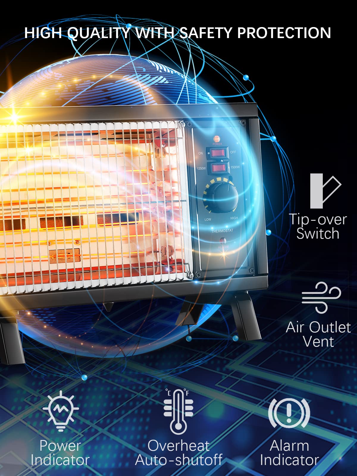 • ❤【POWERFUL 1500W HEAT】CE and ETL certificated, the heater is easy to assemble and maintenance-free. Made by high quality steel, the space heater is solid enough to bear accidental collision. You can choose suitable temp with 1250/1500W adjustable thermostat. Built - in electric heating wires are efficient with a long life span and enjoy a warm winter.