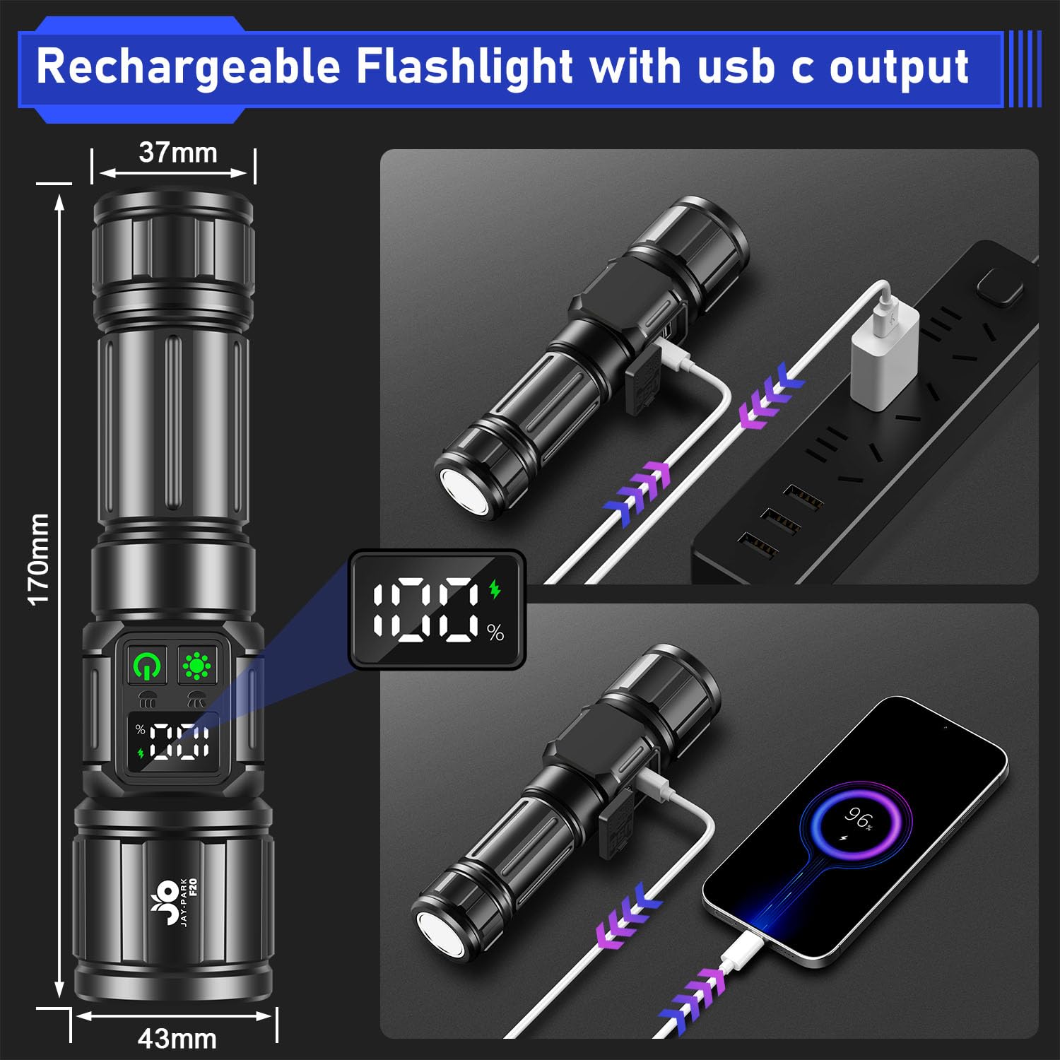 JAY-PARK Flashlights High Lumens, Rechargeable Flashlight 10000 Lumens with Magnetic, Bright Flash Light 9 Modes with 5000 mAh Battery, Tactical Flashlight for Camping, Hiking, Dog Walking