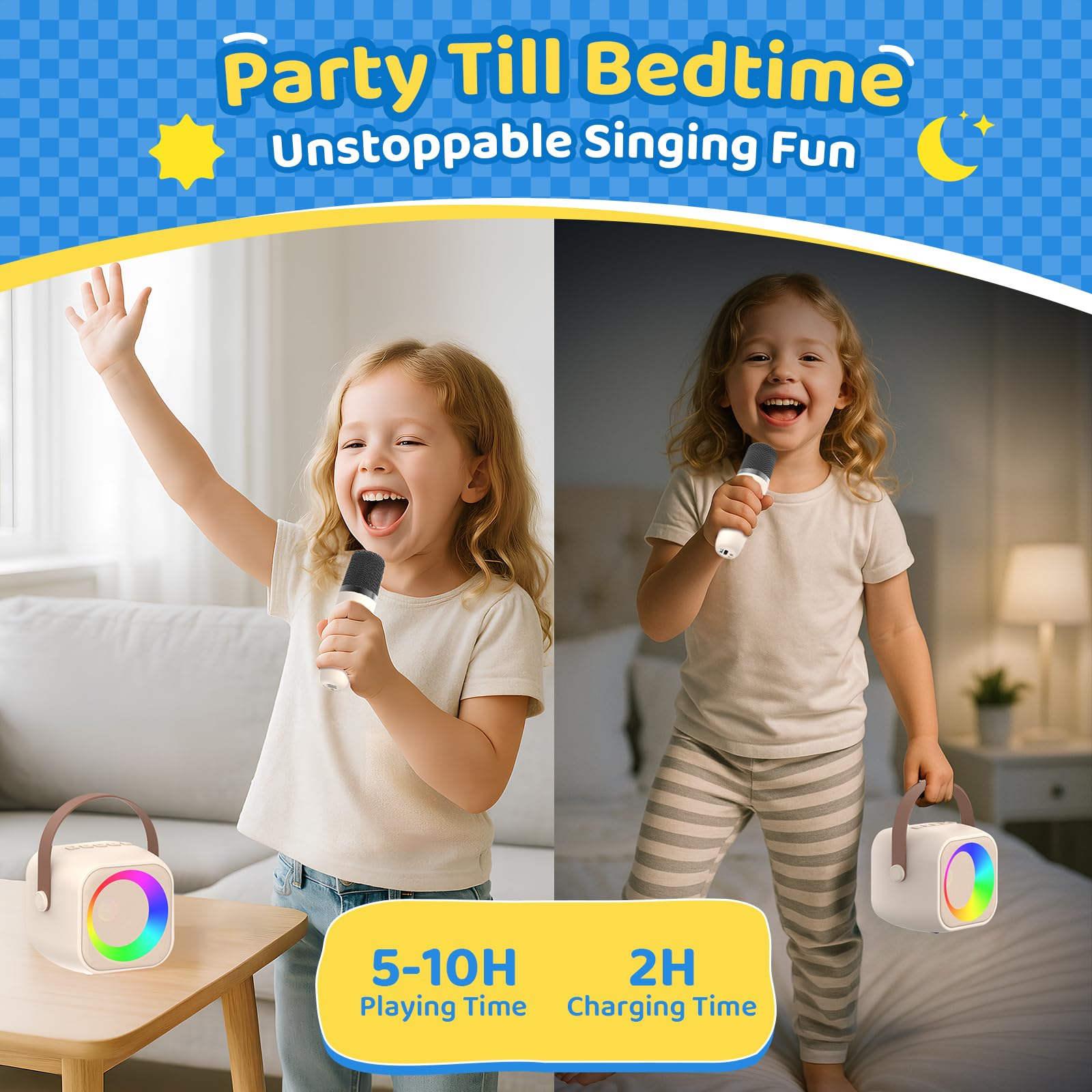• Long Battery Life: Our mini karaoke machine is equipped with a 1800mAh high-efficiency lithium-ion battery, ensuring uninterrupted music playback for up to 5 hours at 50% volume. The microphone also has a built-in 600mAh high-efficiency lithium-ion battery. Whether dancing indoors or partying outdoors, kids can enjoy themselves without any interruption, making it an ideal choice for outdoor gatherings, upstairs parties, or even for carrying it on the go.