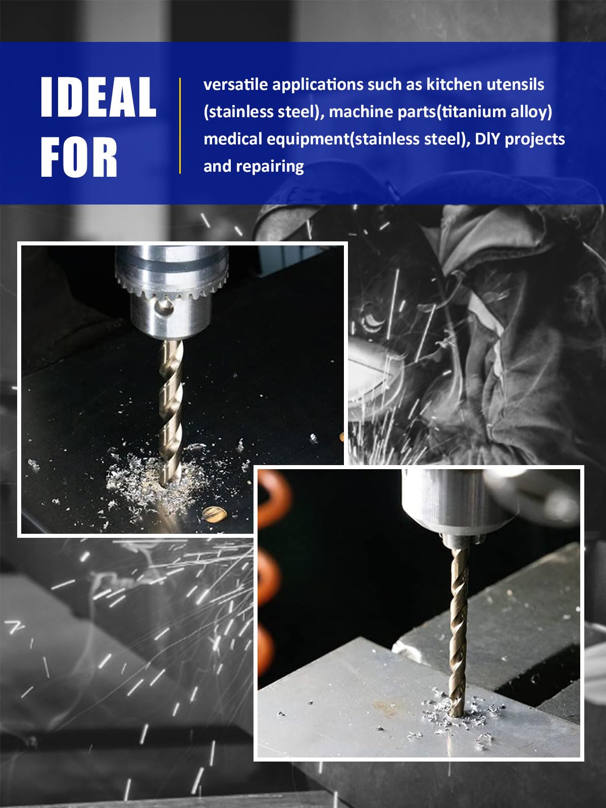 • COBALT JOBBER DRILL BITS:115 piece high speed steel, All Sizes contain 5% cobalt, Not Just Some, to resist high heat wear when drilling. M35 cobalt HSS twist drill bits is more suitable for hardened working material. Particularly adapt to drilling stainless steel, cast iron, high temperature alloy, titanium alloy and even hard plastics, and woods. Can also be used for soft materials.
