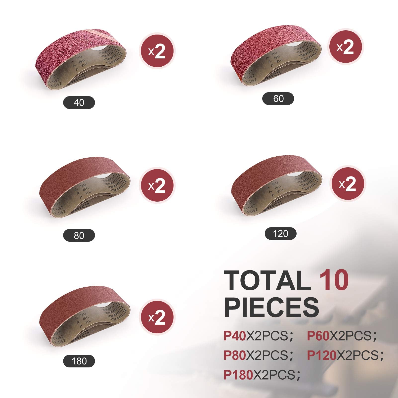 • ๐Ÿ˜๏ธ [10 Pcs Sanding Belts Gifts] - The belt sanders for woodworking come with 2pcs 40 grits, 2pcs 60 grits, 2pcs 80 grits, 2pcs 120 grits and 2pcs 180 grits aluminum oxide sanding belts, they can save your money, meeting the requirements for your different projects.