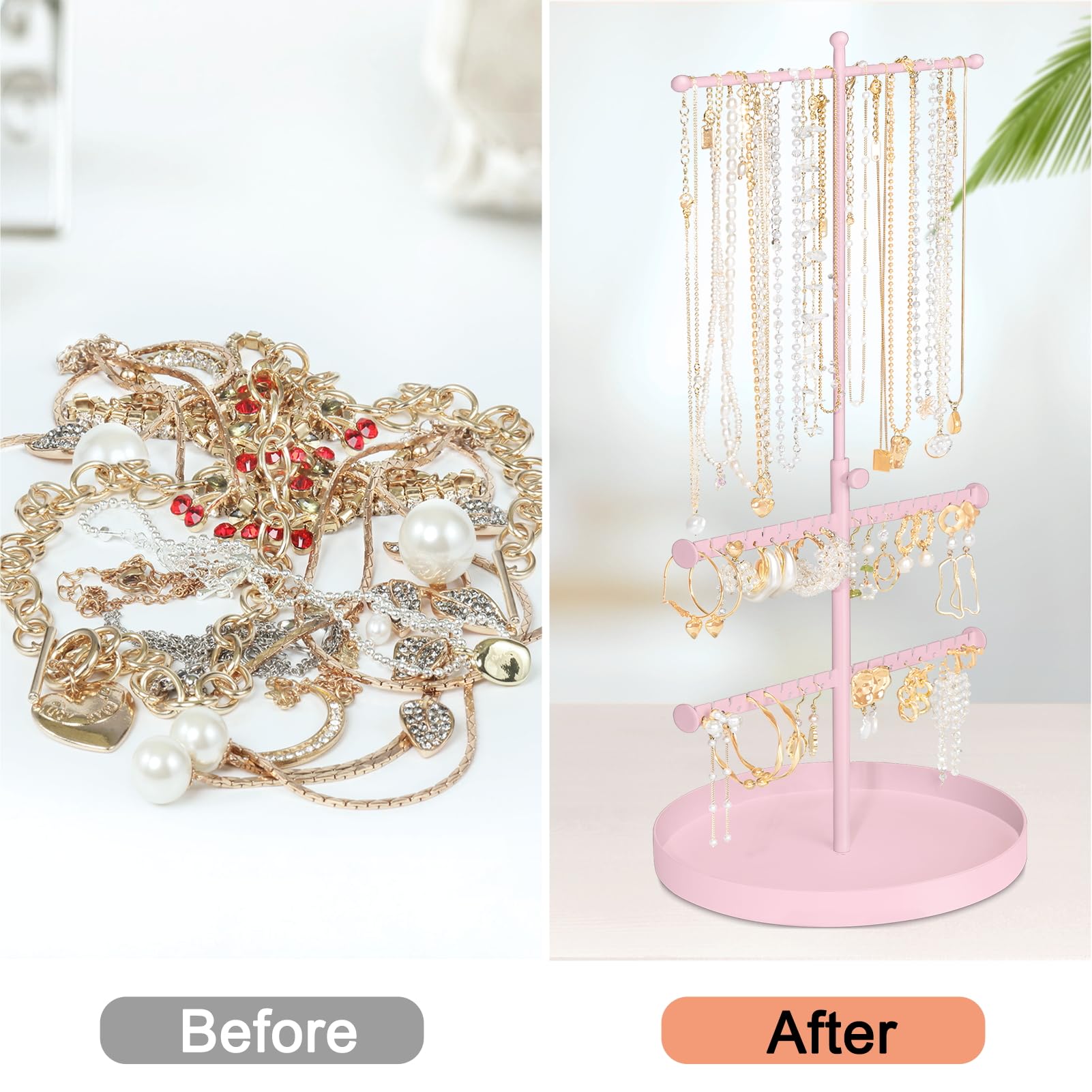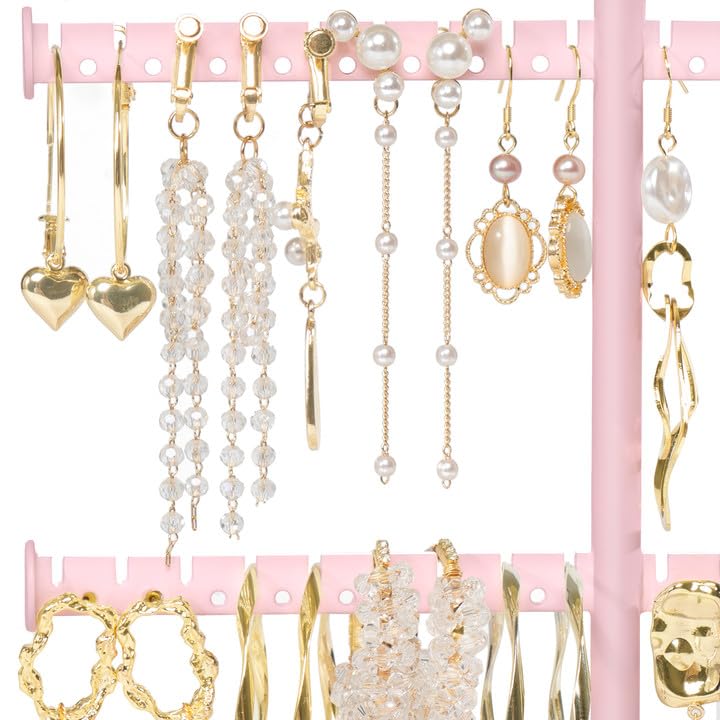 • 💎SUPER LARGE CAPACITY:3-Tier necklace and earring holder can store different kinds of necklaces, hoops, studs, bracelets and watches etc. Equipped with 68 earring holes and 7.88 inch round base, tons of stuff can be orderly organized in this jewlery organizer.