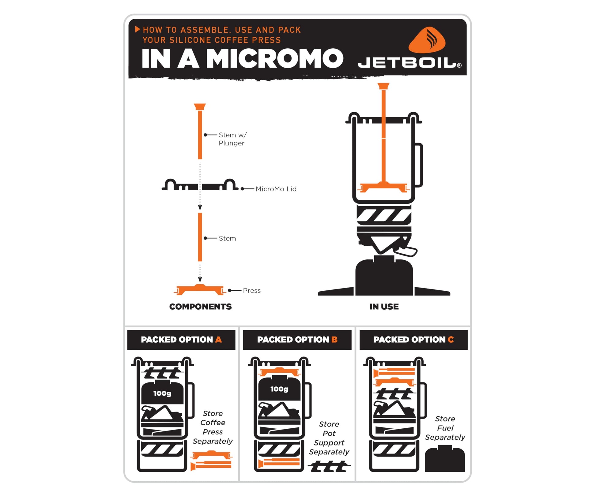 • Create delicious French press style coffee wherever your adventure takes you with the Jetboil Silicone French Press Coffee Maker.