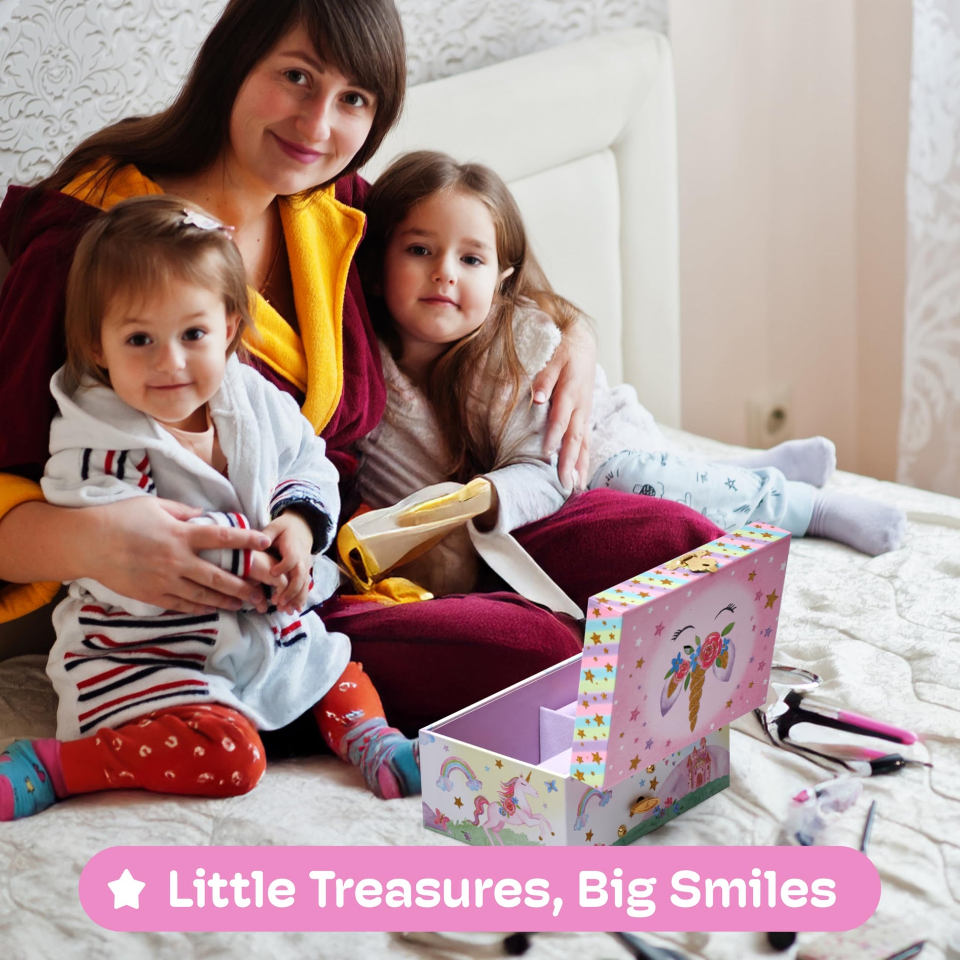 • Durable and Safe: Constructed from sturdy fake wood with a secure silver-tone latch, this kid jewelry box for girls meets all safety standards, ensuring it is a reliable and long-lasting organizer;