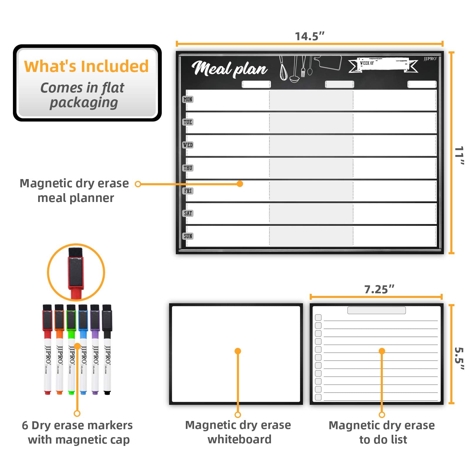 • COMBO SET provides flexibility - JJPRO meal planner board set includes one 14.5'x11' magnetic meal planner and two 7.25'x5.5' magnetic whiteboards. This combo set fits most size refrigerators mini or full size, single door or side-by-side, super flexible and easy to use!