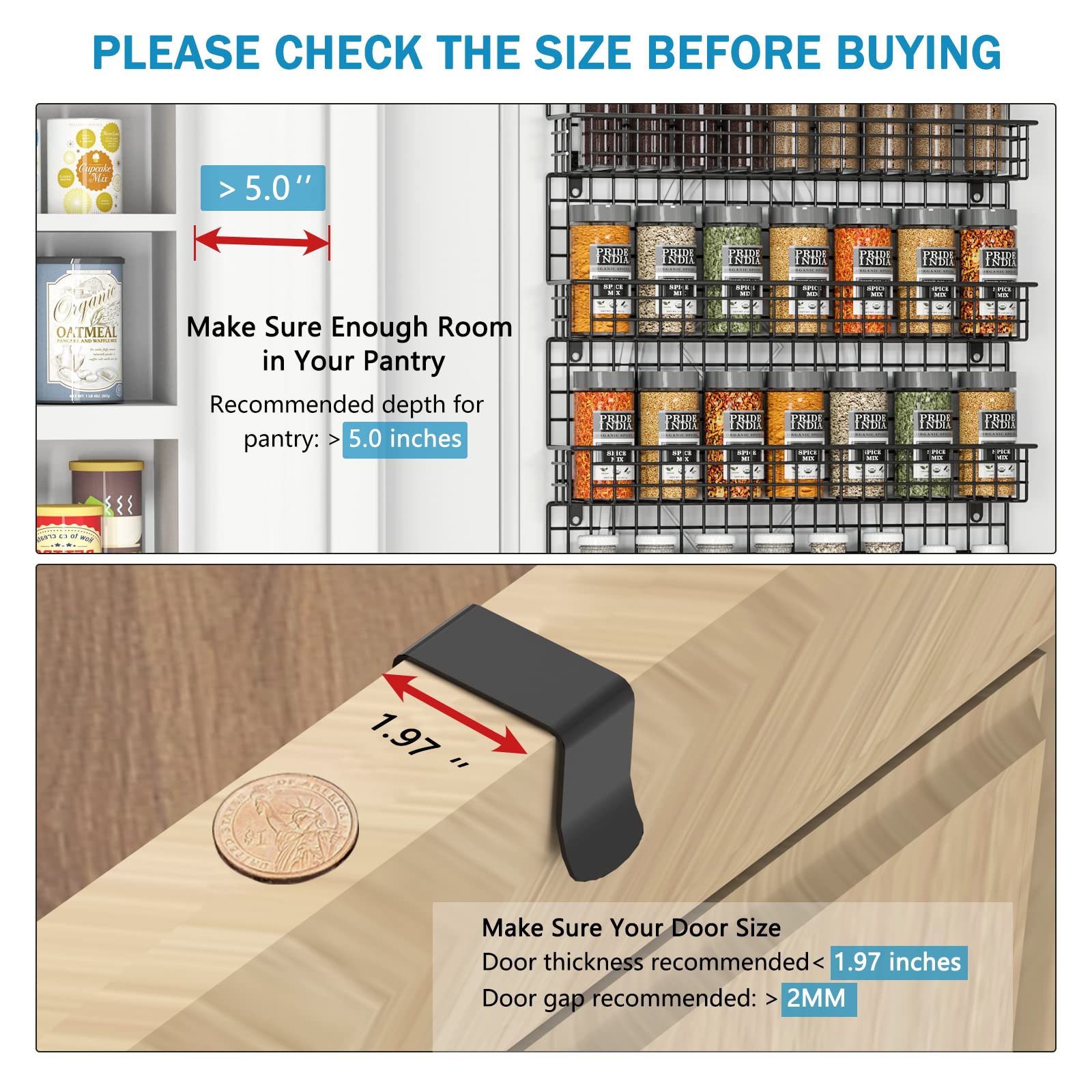 • 【Sturdy and durable Spice racks】 Our spice racks are made of thick iron wire, and the surface is treated with black powder coating, which is not only durable, but also resistant to rust. Contains installation hardware and instructions. The package contains 6 rack, 3 small-sized spice racks, and 3 large-sized spice racks. Small size: 16.3'L x2.6'W x5.7'H; Large size: 16.8'L x4.7'W x 6.7'H
