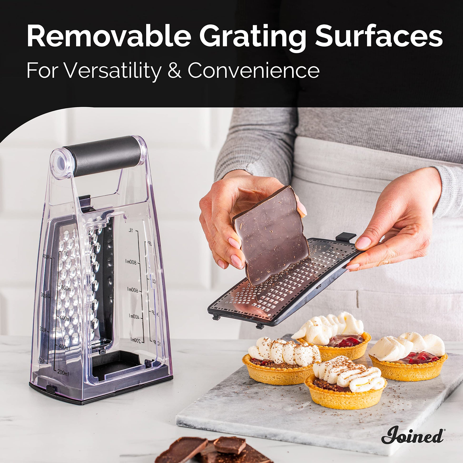 • Effortless Blade Switching. This kitchen grater offers 3 different grating surfaces: coarse, medium, and fine. Switching between surfaces is zero-hassle, with no need for multiple different graters. The compact design fits conveniently into drawers and saves you kitchen space.