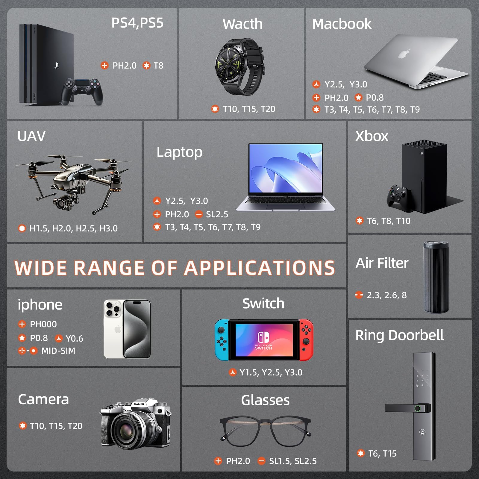 • 【52-in-1 precision screwdriver set】 including Philips PH0000(+1.0) PH000 (+1.5) PH00 (+2.0) PH0 PH1, etc.; Flathead SL1.0 SL1.5 SL2.5 SL3.5; Torx T1 T2 T3 T4 T5; Torx Security TR6 TR7 TR8 TR9 TR10, etc.; Tri-point Y000 (Y0.6) Y00 (Y1.5) Y0 (Y2.5), etc.; Pentalobe P2(0.8) P5(1.2); Hex H0.7 H0.9 H1. 0 H1.3 H1.5 H2.0 etc.; Triangle 2.0 2.3 3.0 3.7; U2.3 U2.6; MID 2.5; SIM. It also comes with two double-ended pry bars to facilitate repairs; and a model sticker to help you quickly identify the bit.