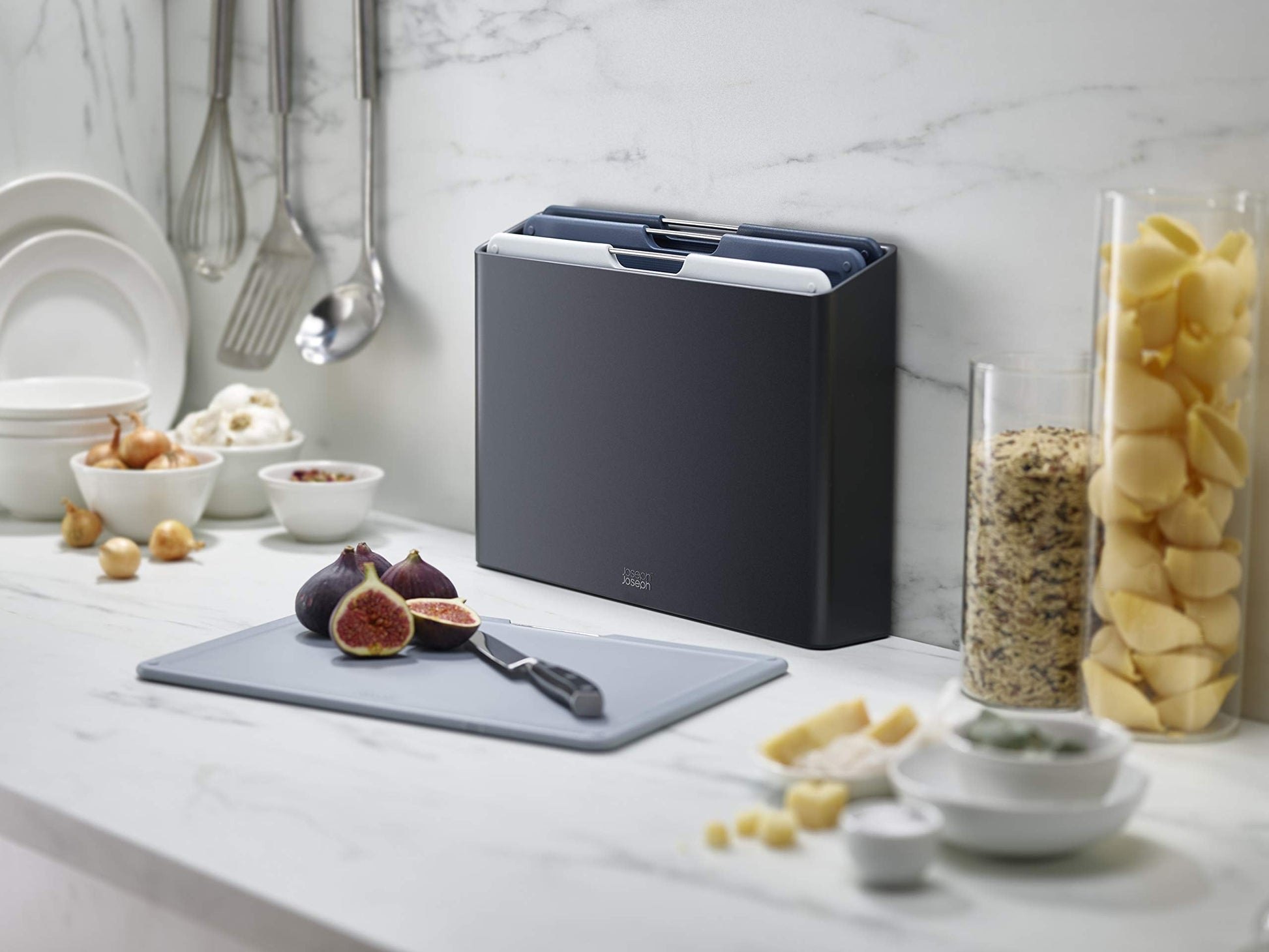 Details: Joseph Joseph Folio Plastic Cutting Board Set with Storage Case Color-Coded Easy-Access Design Dishwasher Safer Non-Slip, Large, Graphite