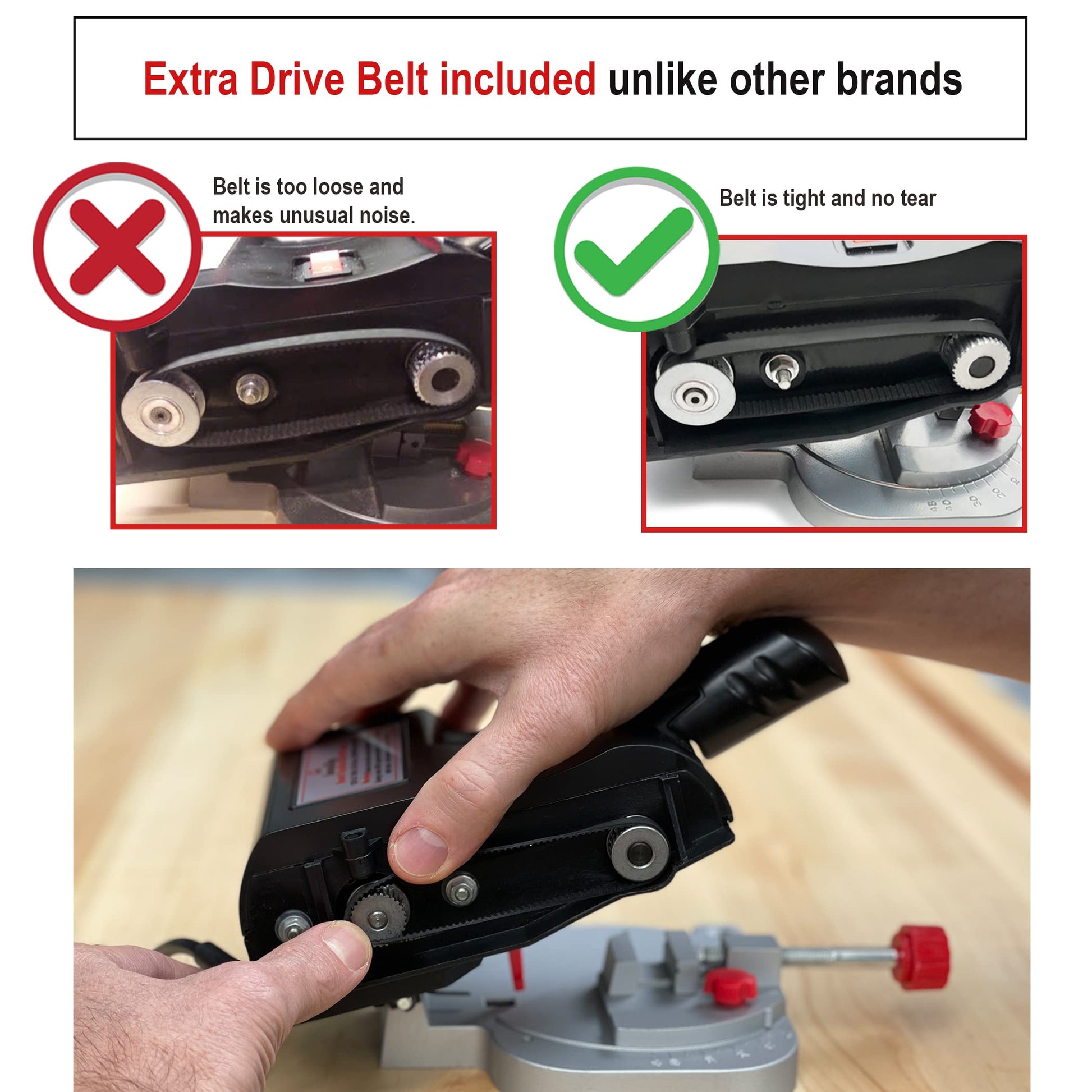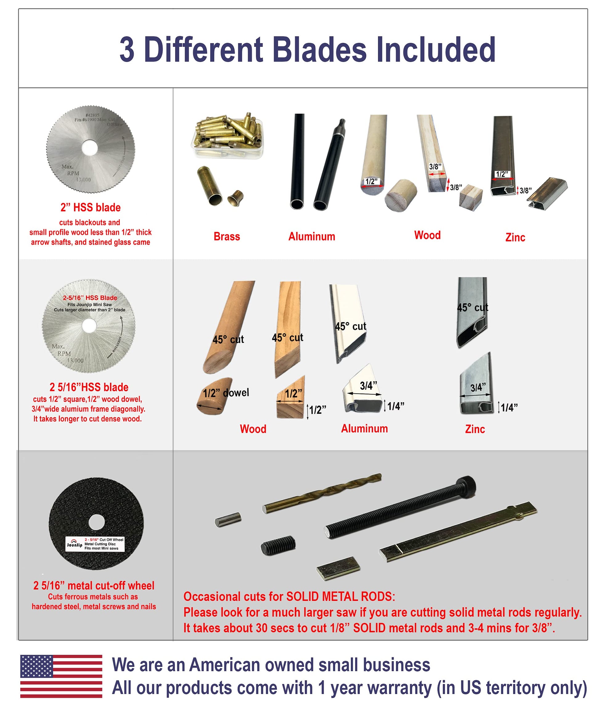 • Includes 3 Blades - 2” HSS, 2 5/16" HSS, 2 5/16" Black Cut off Wheel (3/8 inch arbor), 71" power cord, miter guage holder, table clamp, motor brush replacements, and hex key