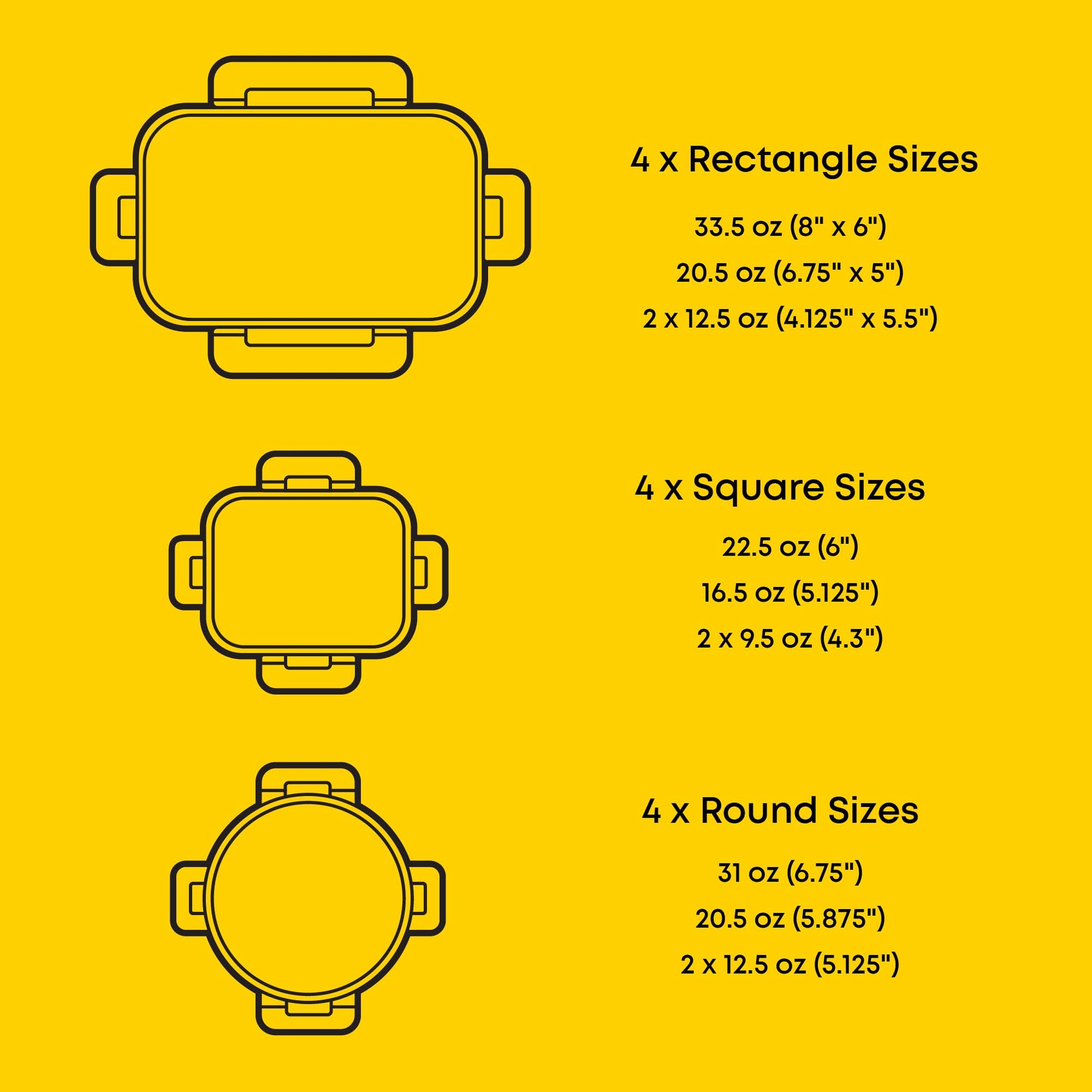 • 12 SIZES FOR EVERY NEED: Our airtight food storage containers with lids set includes 4 rectangle containers 35oz (8x6in), 21oz (6.75x5in), 12oz (two 4.2x5.5in). 4 square containers 27oz (6in), 17.5oz (5.2in), 11oz (two 4.3in). 4 round containers 32oz (6.75in). 21oz (5.9in), 13.5oz (two 5.2in). Height ranges from 1.75-2.3 inches.