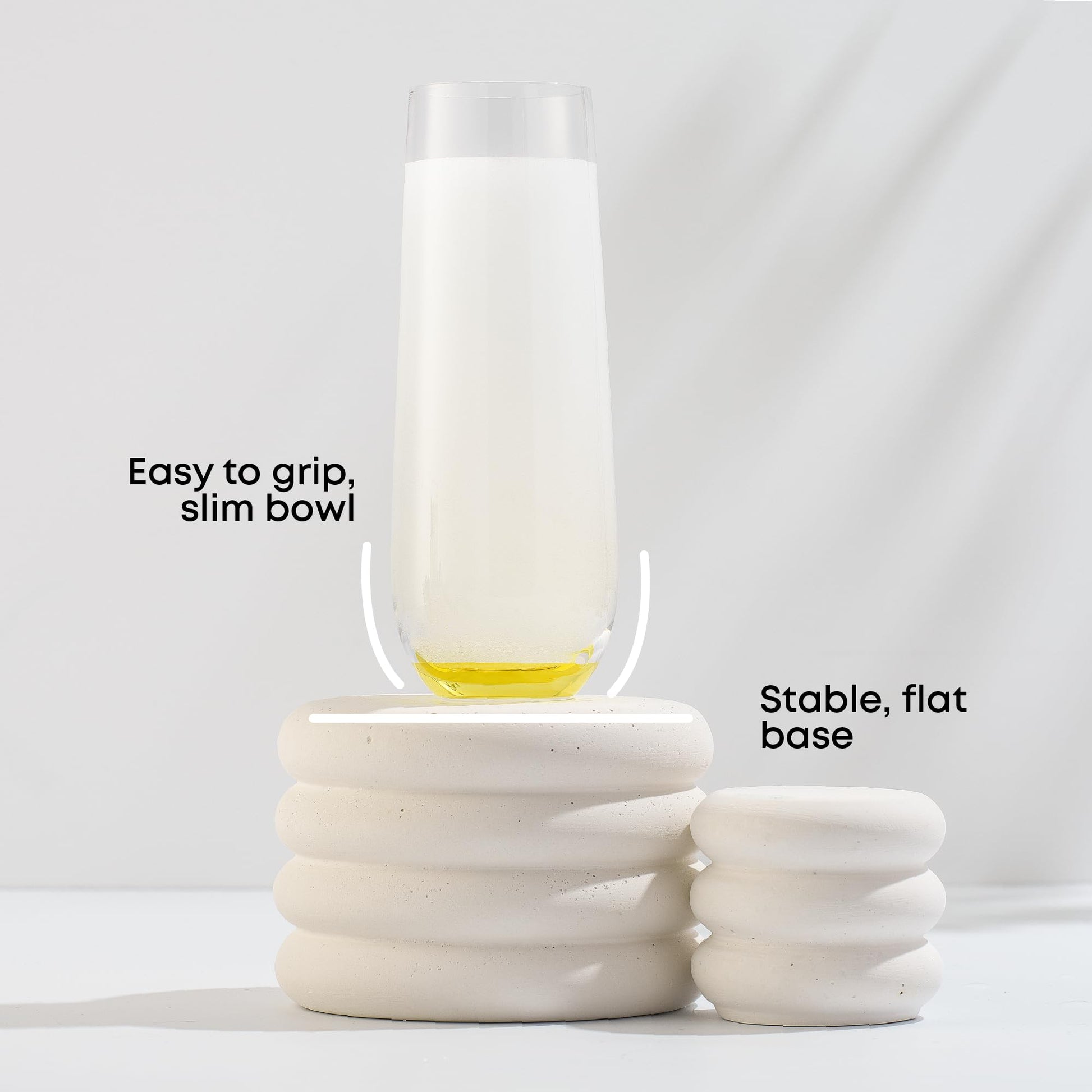 • EASY TO HOLD: Each stemless champagne flute features a slim bowl that’s perfectly weighted and oh-so comfortable to grip. Not too heavy it slips from your grip and not too light. At 2.36” wide and 6.25” tall with a perfect flat bottom, Hue glasses perfectly balance your bubble’s aromatic bouquet.
