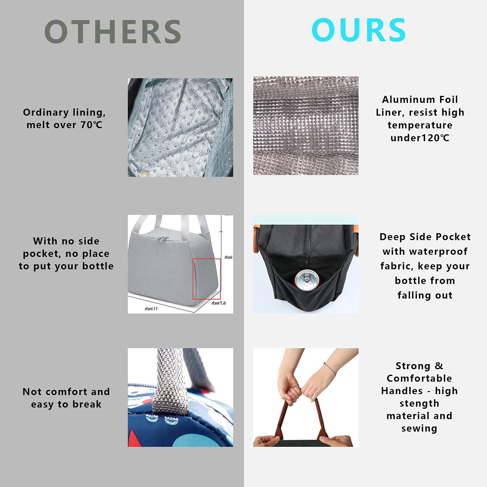 • ❤KEEP FRESH & WARM: This insulated lunch bag is made of water-resistant leakproof oxford cloth, easy clean food safe aluminum foil inner lining, and padded with thicken EPE foam will keep your food cold or thermal for 4-6 hours. Tips: Putting ice packs into the bag could keep cold for longer time.